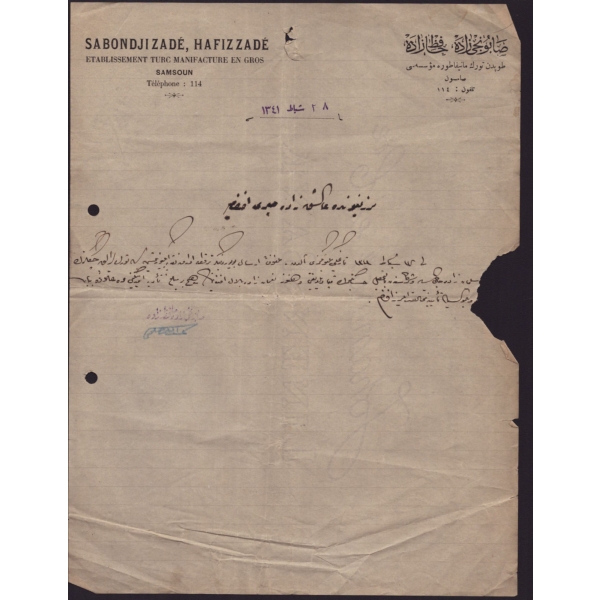 "Sabuncuzade Hafızzade Toptan Türk Manifatura Müessesi, (Samsun)" antetli, 28 Şubat 1341 tarihli mektup, 22x29 cm...