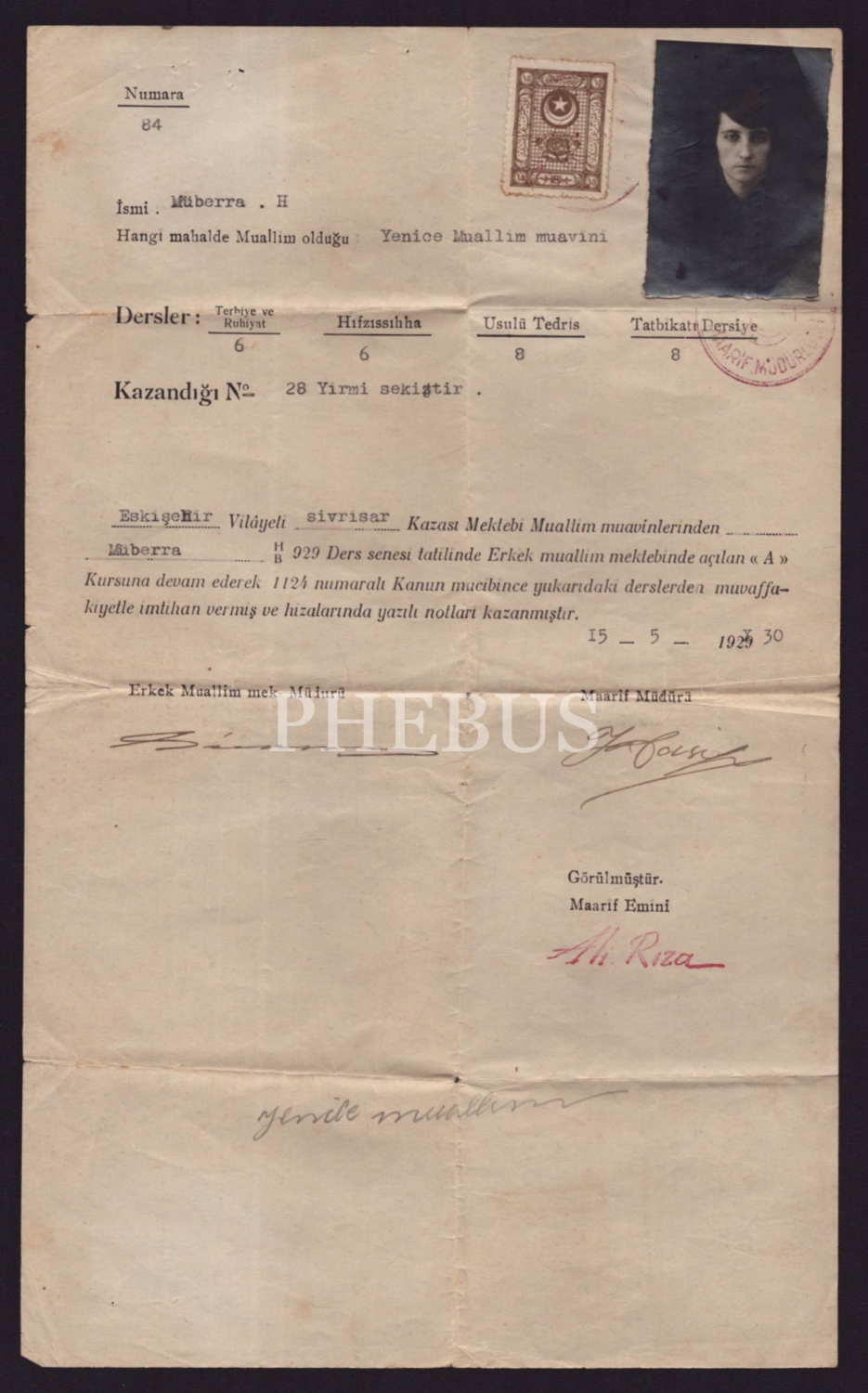 Eskişehir´in Sivrihisar ilçesinde stajyer öğretmenlik görevini yerine getiren Müberra Hanım´ın sene sonunda girdiği öğretmenlik sınavının sonuçlarını gösteren belge, 15 Mayıs 1930, 21x34 cm...