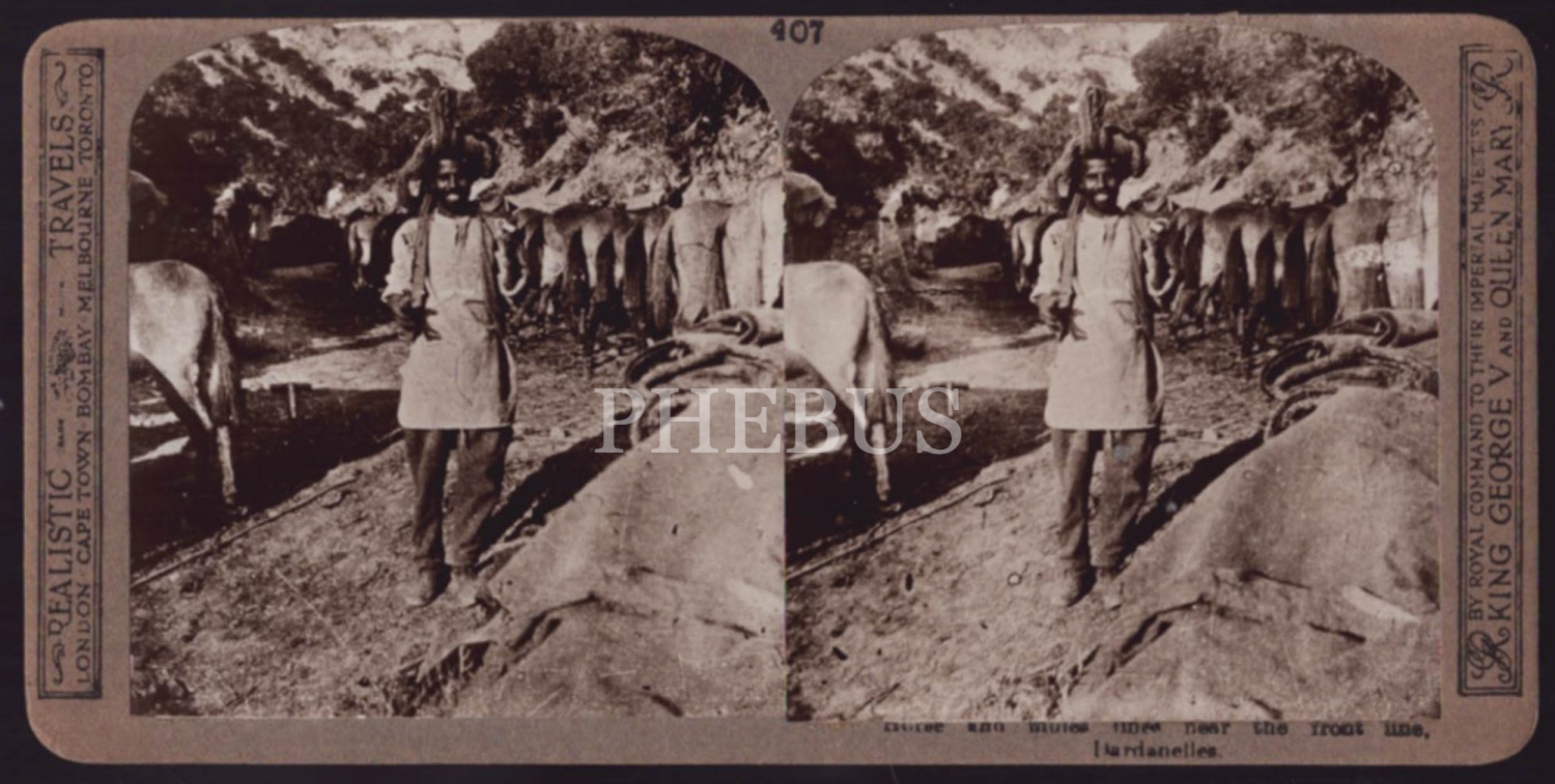 Birinci Dünya Savaşı´ndan stereoview fotoğraf:Çanakkale Cephesi´nde kullanılan atların bakımıyla ilgilenen sorumlu ve atlar, 18x9 cm...