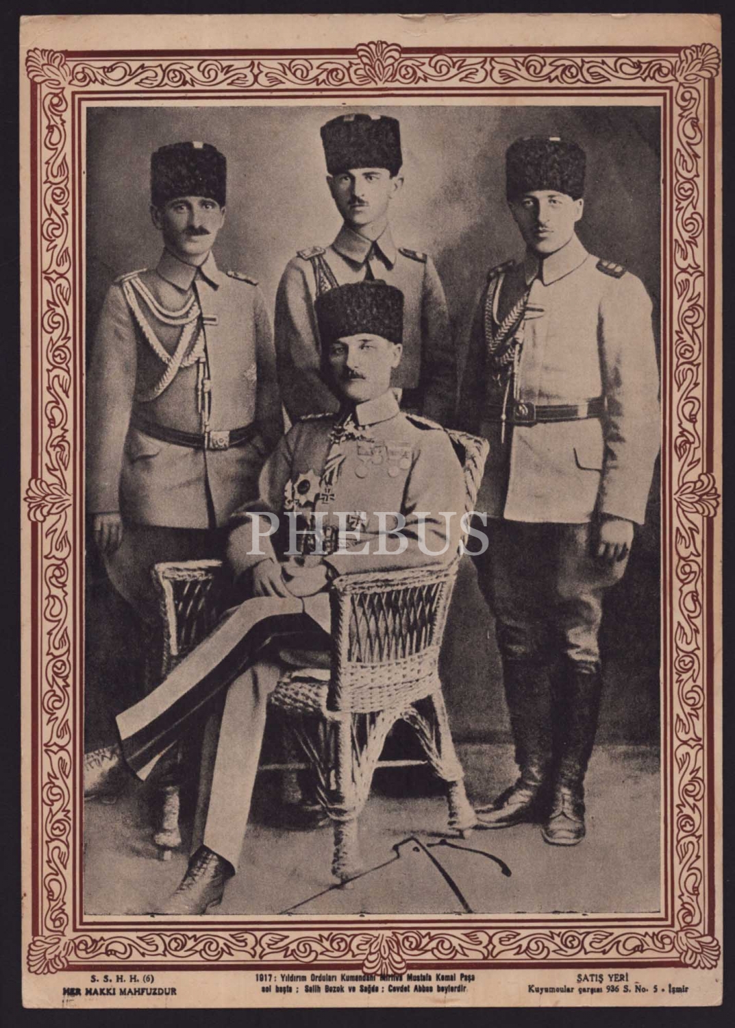 Alt başlıkta, "1917: Yıldırım Orduları Kumandanı Mirliva Mustafa Kemal Paşa, solbaşta; Salih Bozok ve sağda; Cevdet Abbas beylerdir" yazılıdır.
