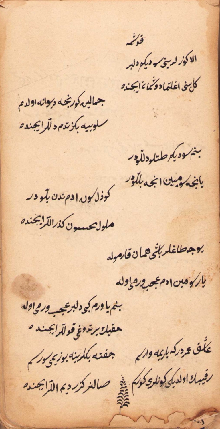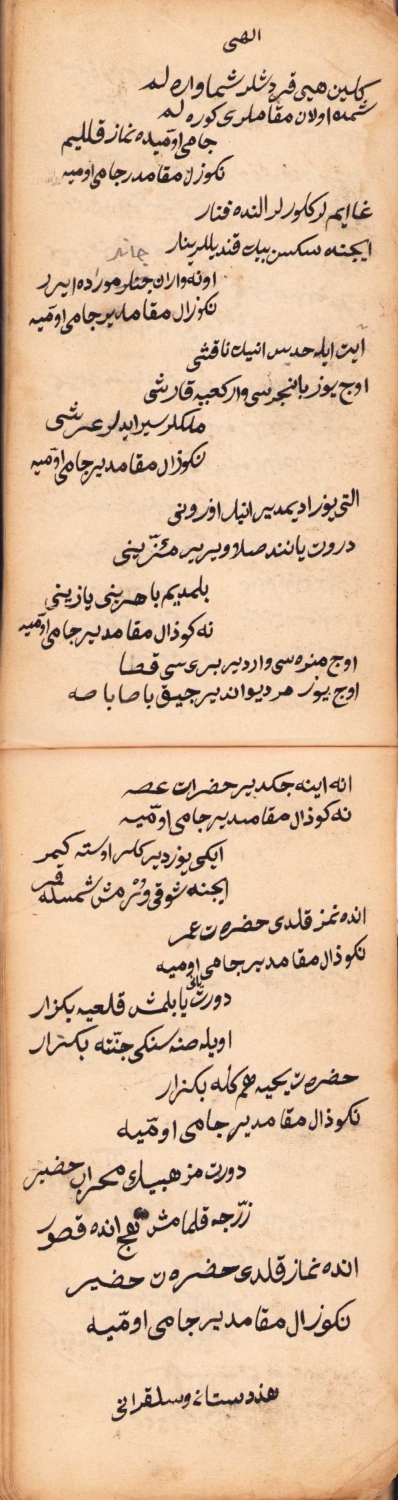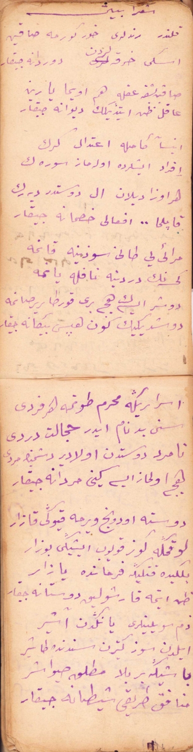 Cönk, muhtelif beyitler, türki, ilahi, koşma, dua, hutbe, naat-ı şerif ve destanlar yazılı, 132 varak, 8,5x18 cm.