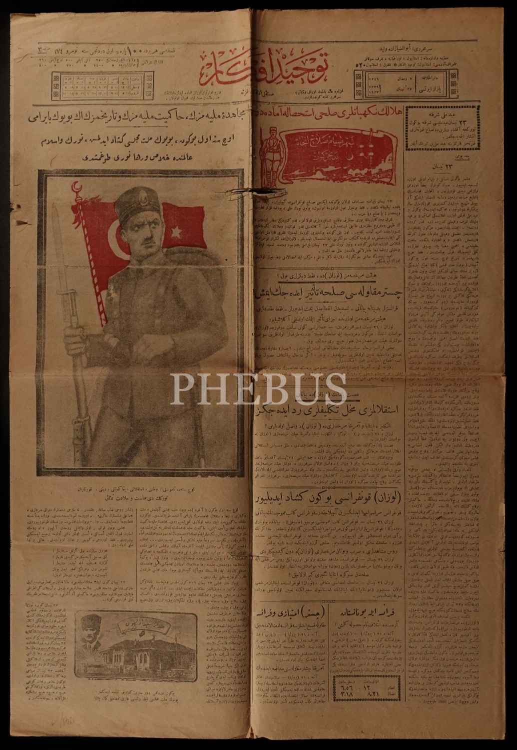 "Mücahede-i Milliyemizin, Hakimiyet-i Milliyemizin ve tarihimizin en büyük bayramı" manşetiyle Millet Meclisi´nin açılışının 3. yıldönümünü kutlayan TEVHİD-İ EFKAR gazetesinin 23 Nisan 1923 tarihli nüshası, 43x63 cm...