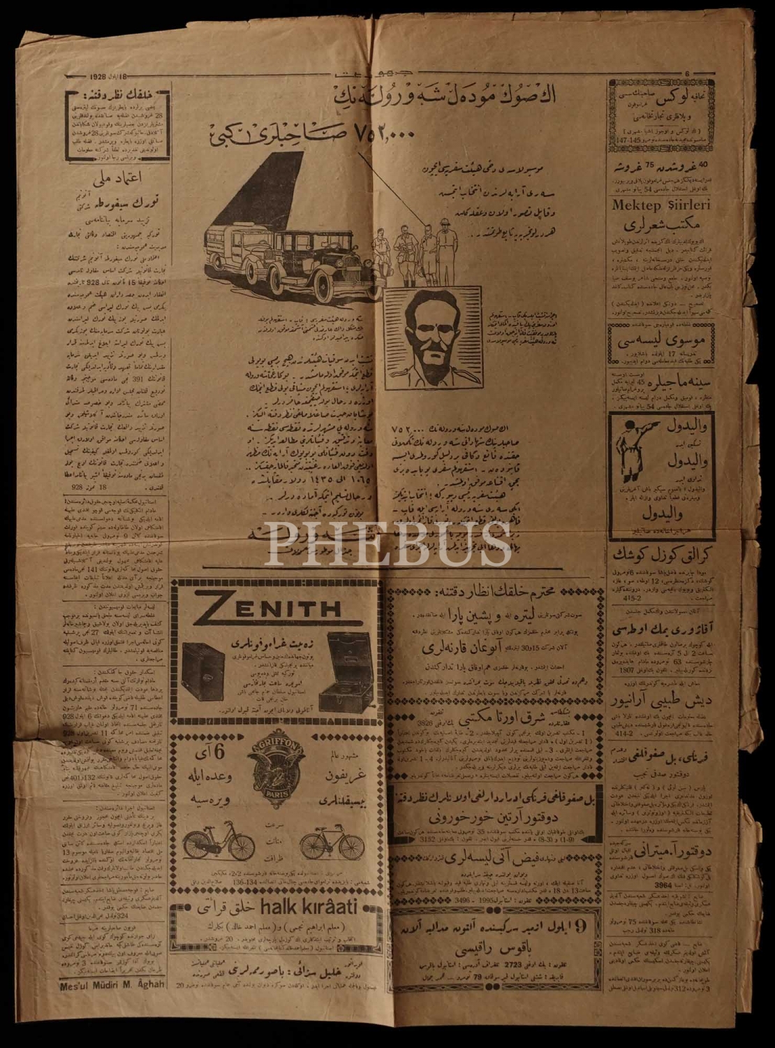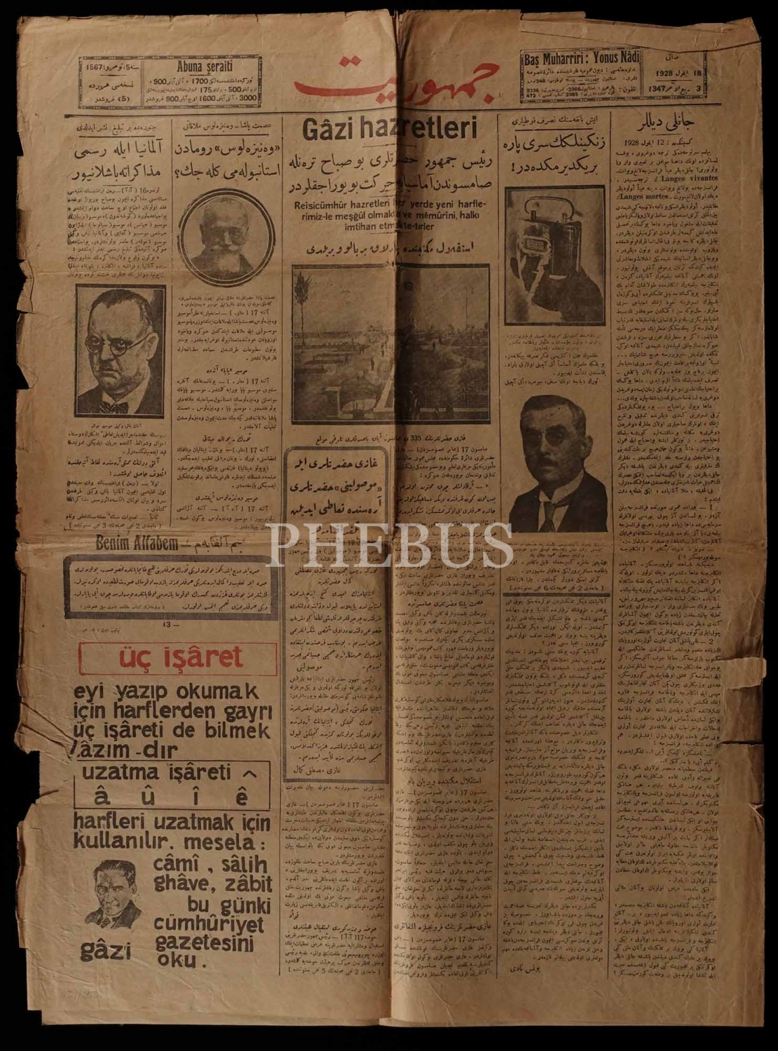 "Reisicümhur hazretleri her yerde yeni harflerimizle meşgul olmakta ve memurini, halkı imtihan etmektedirler." manşetli CUMHURİYET gazetesinin 18 Eylül 1928 tarihli nüshası, 45x62 cm...