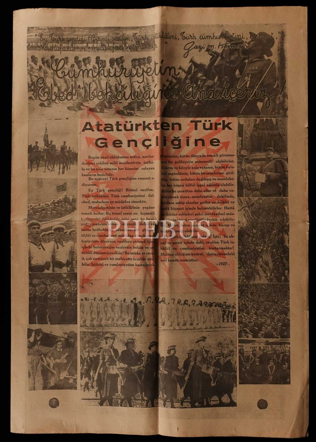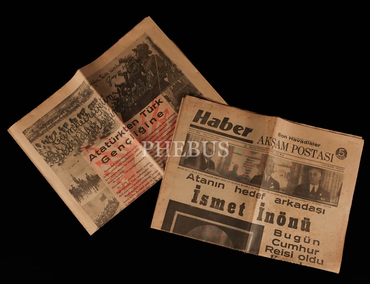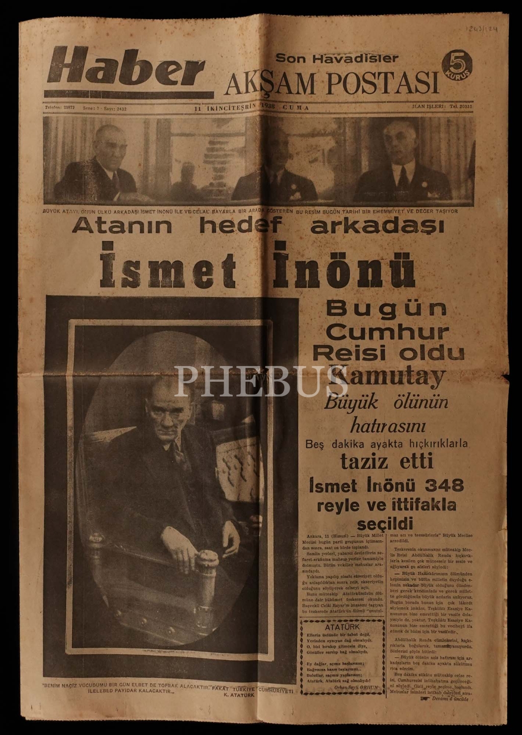 Mustafa Kemal Atatürk görselli, Mustafa Kemal Atatürk´ün vefatının ertesi günü İsmet İnönü´nün Cumhurbaşkanı seçilmesini konu alan HABER gazetesi, 11 Kasım 1938, 39x55 cm...