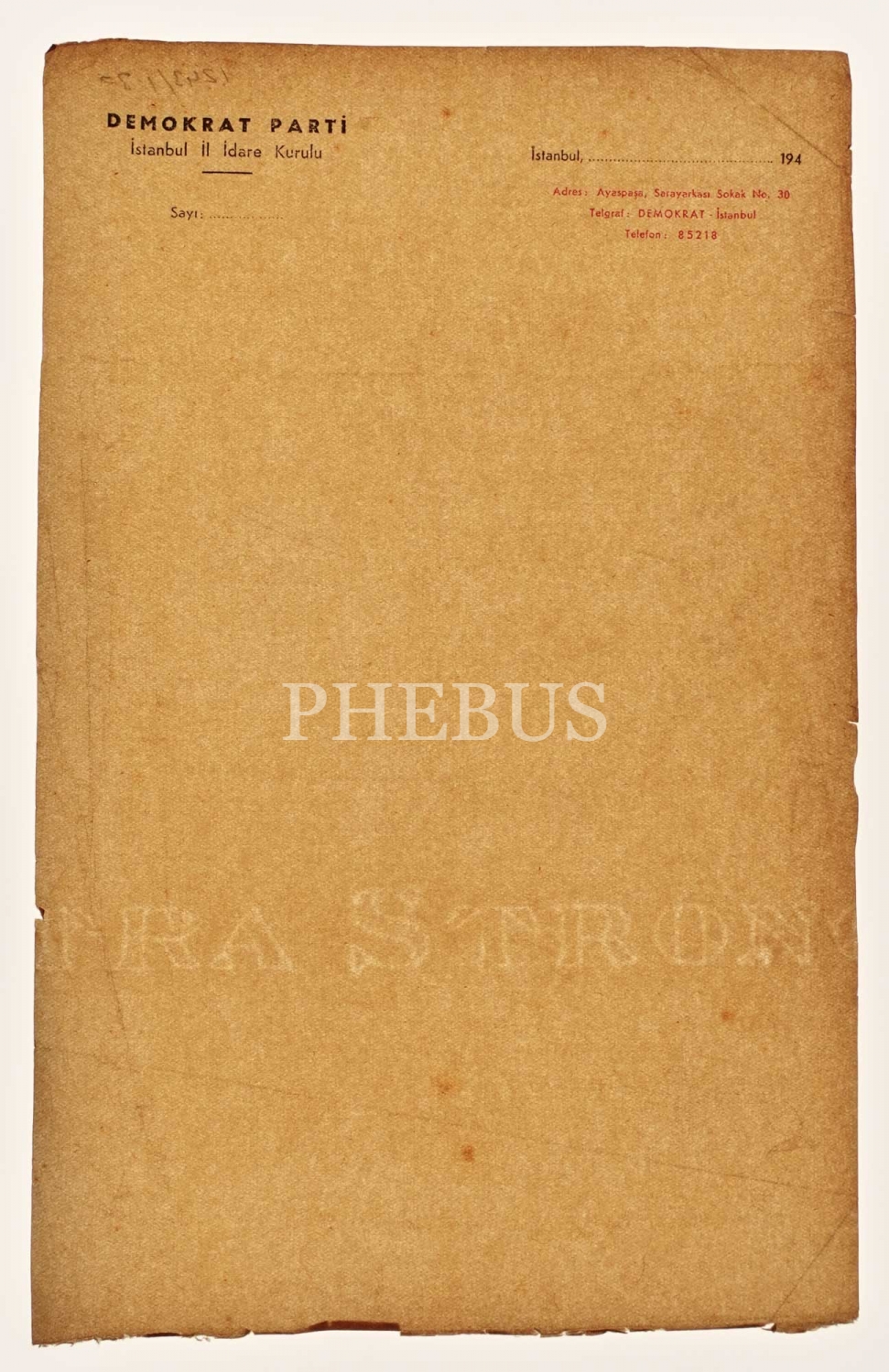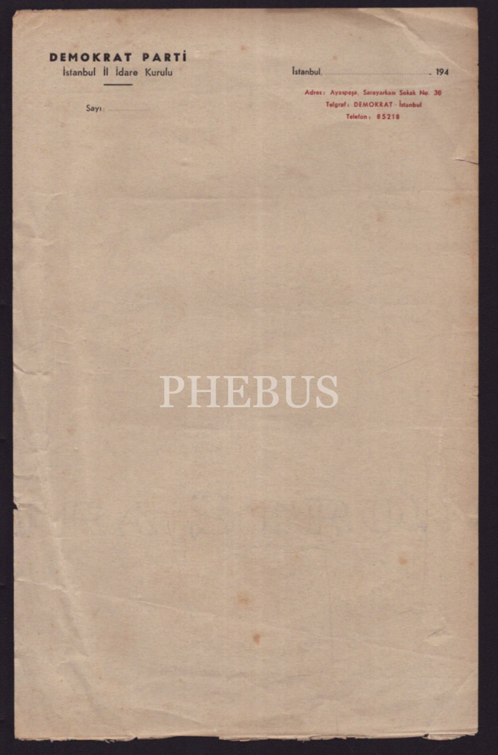 "Demokrat Parti İstanbul İl İdare Kurulu" antetli boş kağıt, 15x23 cm...