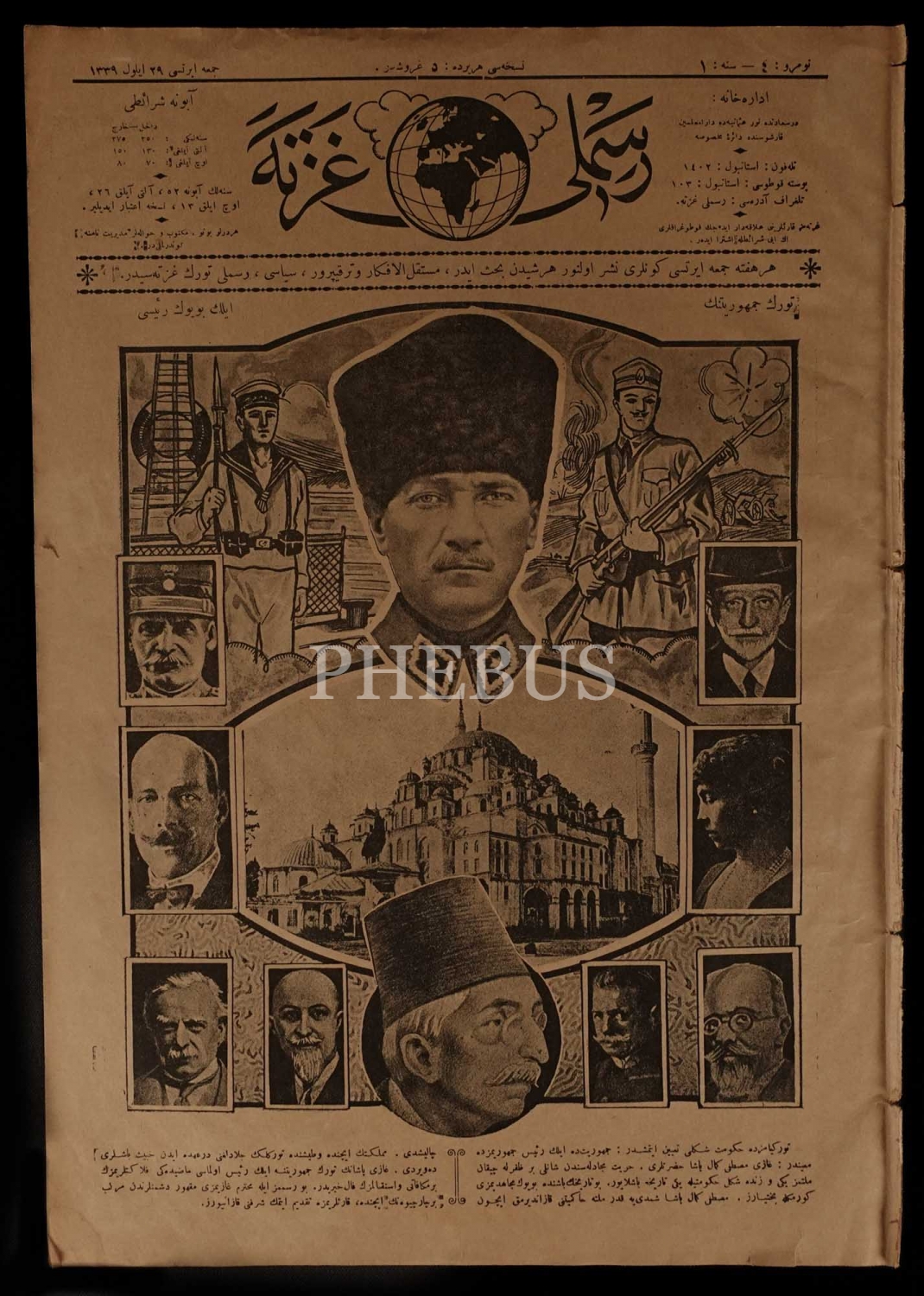 Cumhuriyet´in ilanını ve Mustafa Kemal Atatürk´ün ilk Cumhurbaşkanı seçilmesini konu alan RESİMLİ GAZETE´nin 29 Eylül 1339 (1923) tarihli nüshası, 28x39 cm...