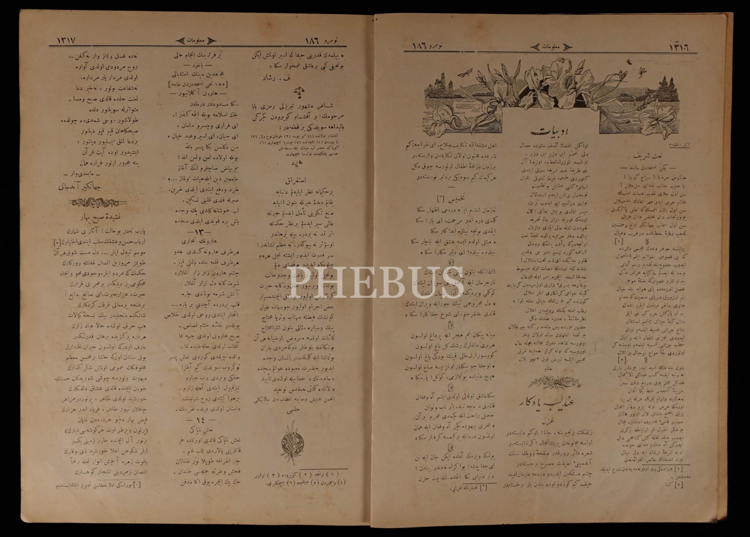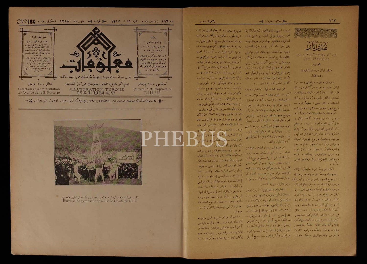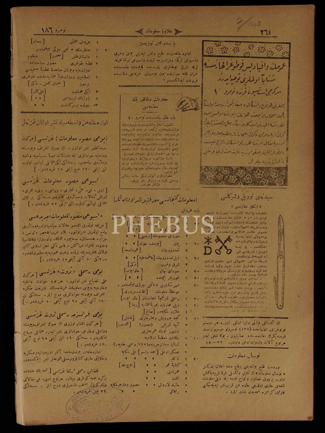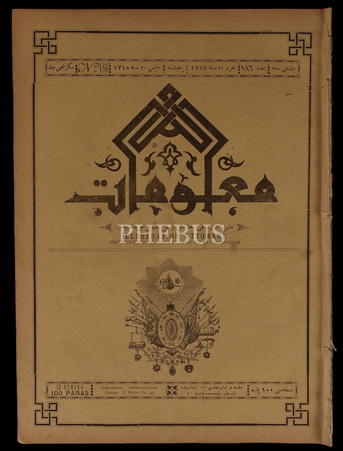 Sultan İkinci Abdülhamid tuğralı ve Osmanlı Devlet armalı kapağıyla "MALUMAT" gazetesinin 12 Muharrem 1318 tarihli 186. sayısı, 24x33 cm...