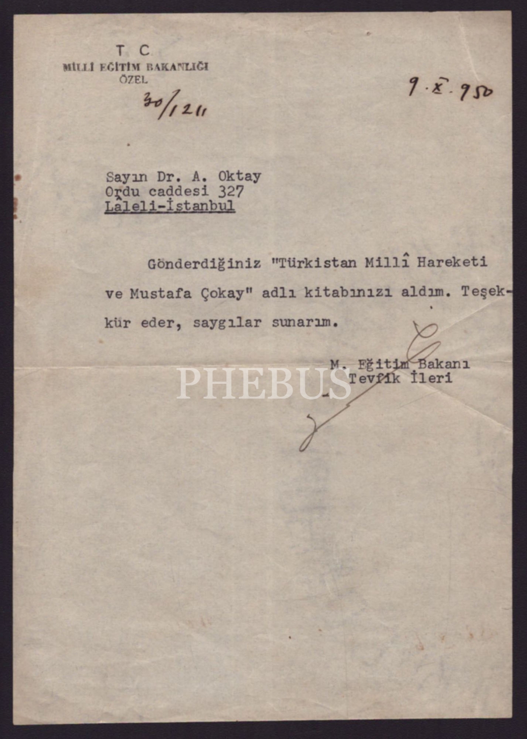Eski Milli Eğitim Bakanı Ahmet Tevfik İleri´nin ıslak imzasını taşıyan ve Dr. A. Oktay´a hitaben kaleme alınmış mektup, 9 Ekim 1950, 15x21 cm...