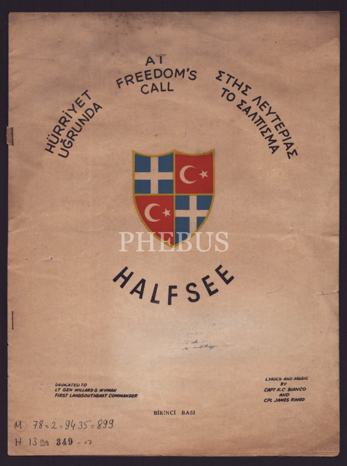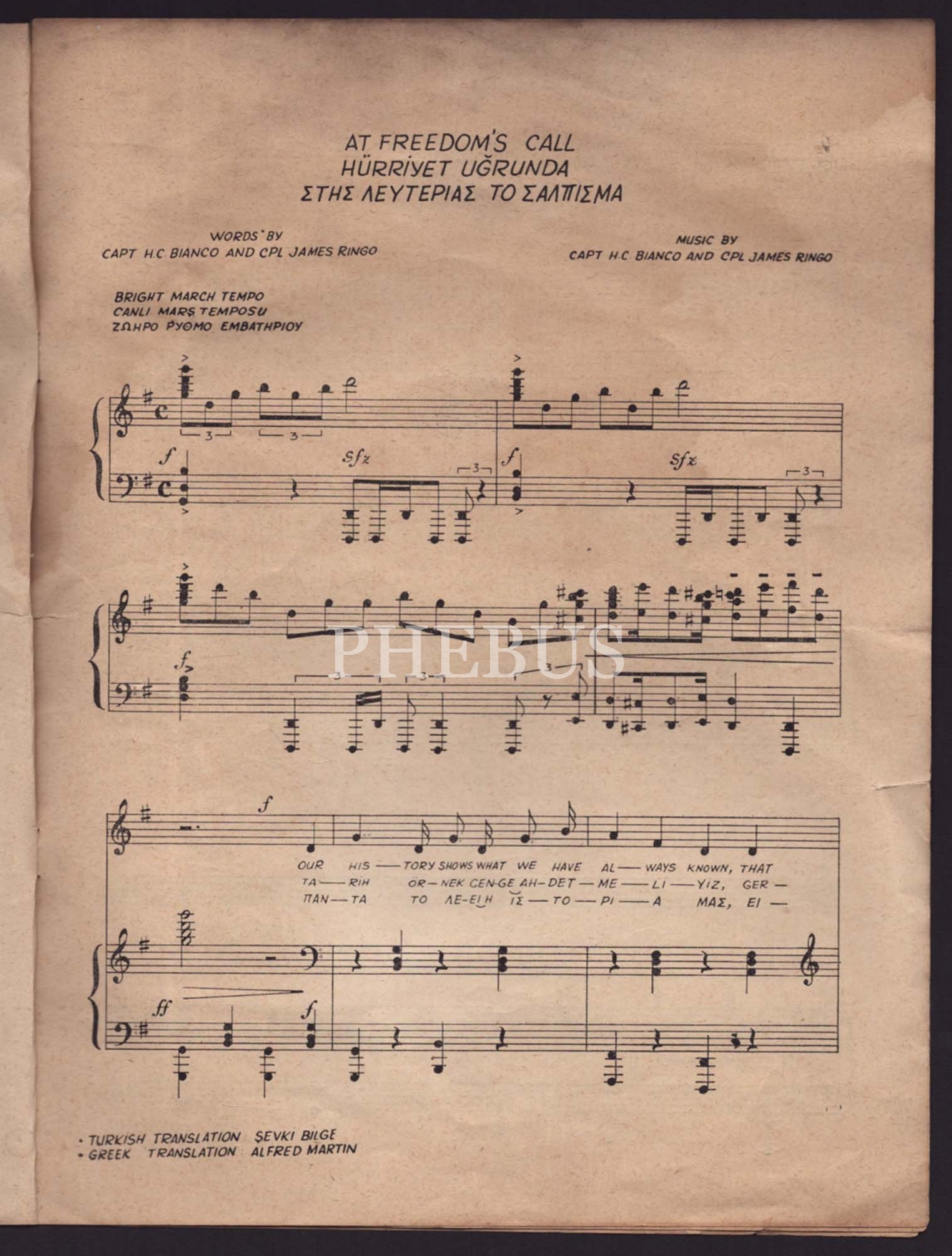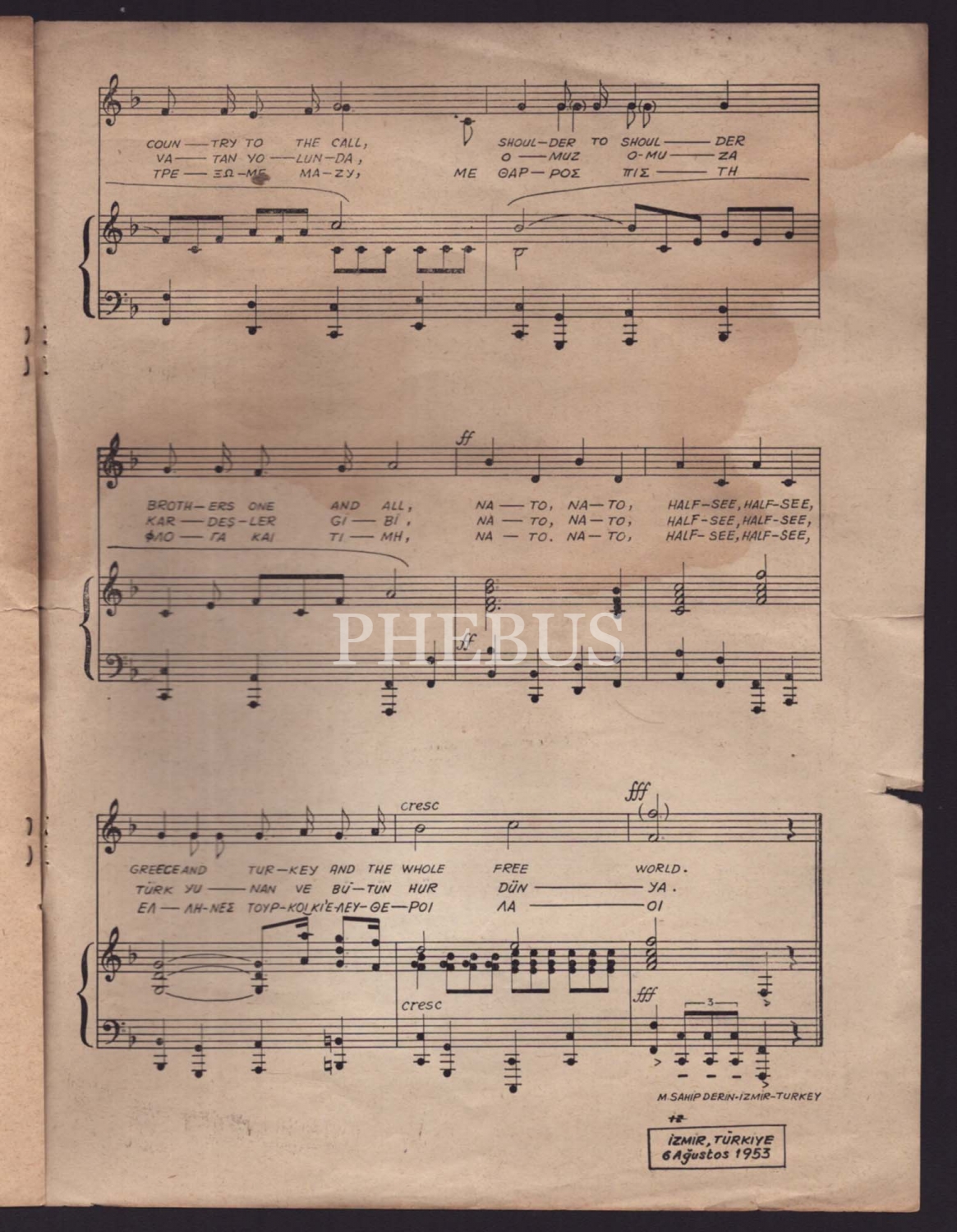 Türkiye ve Yunanistan´ın nato ortakları olması münasebetiyle yayımlanmış "Hürriyet Uğrunda" adlı bestenin nota defteri, Türkçe, İngilizce ve Rumca, 5 sayfa, 24x31 cm...