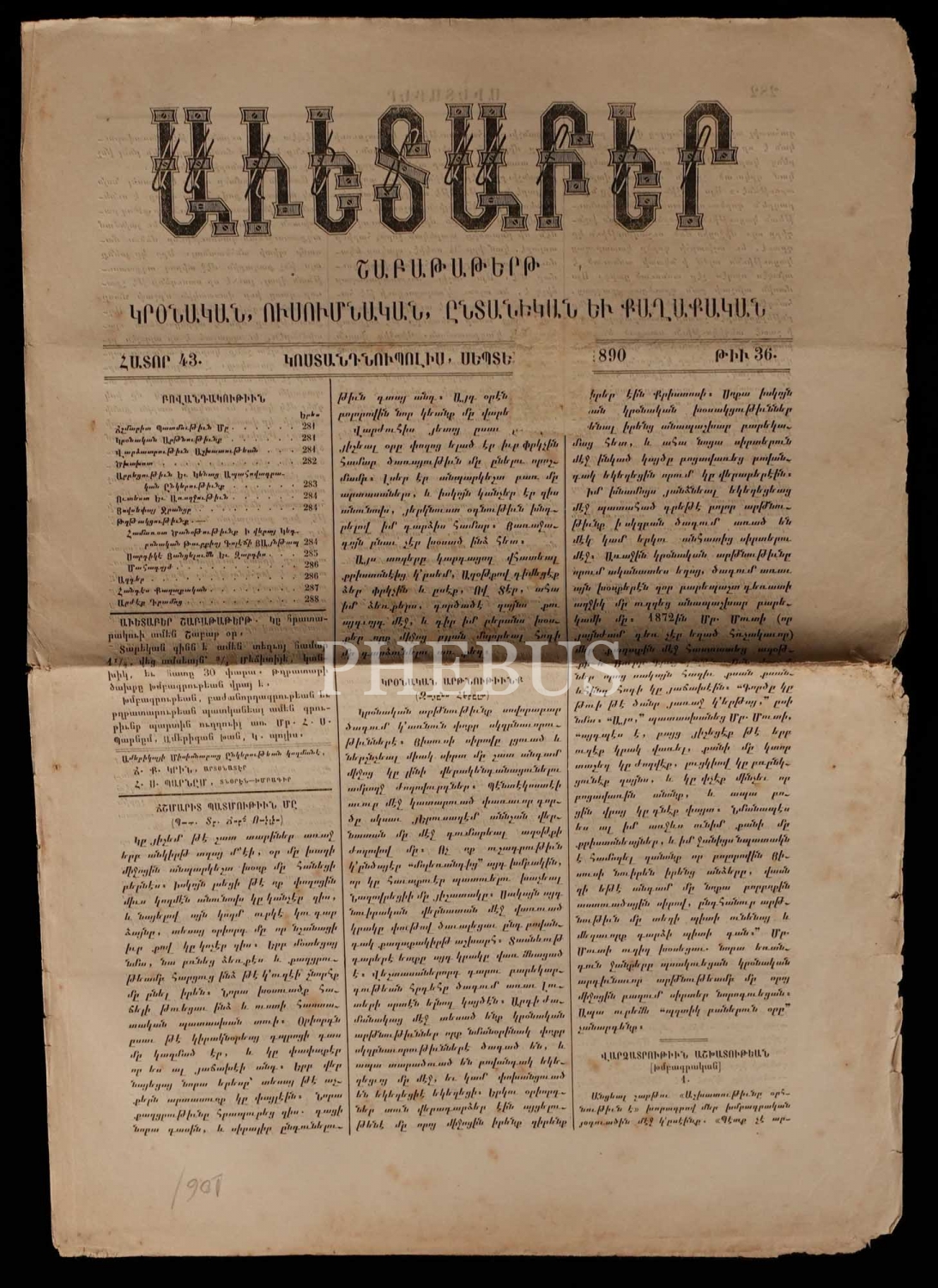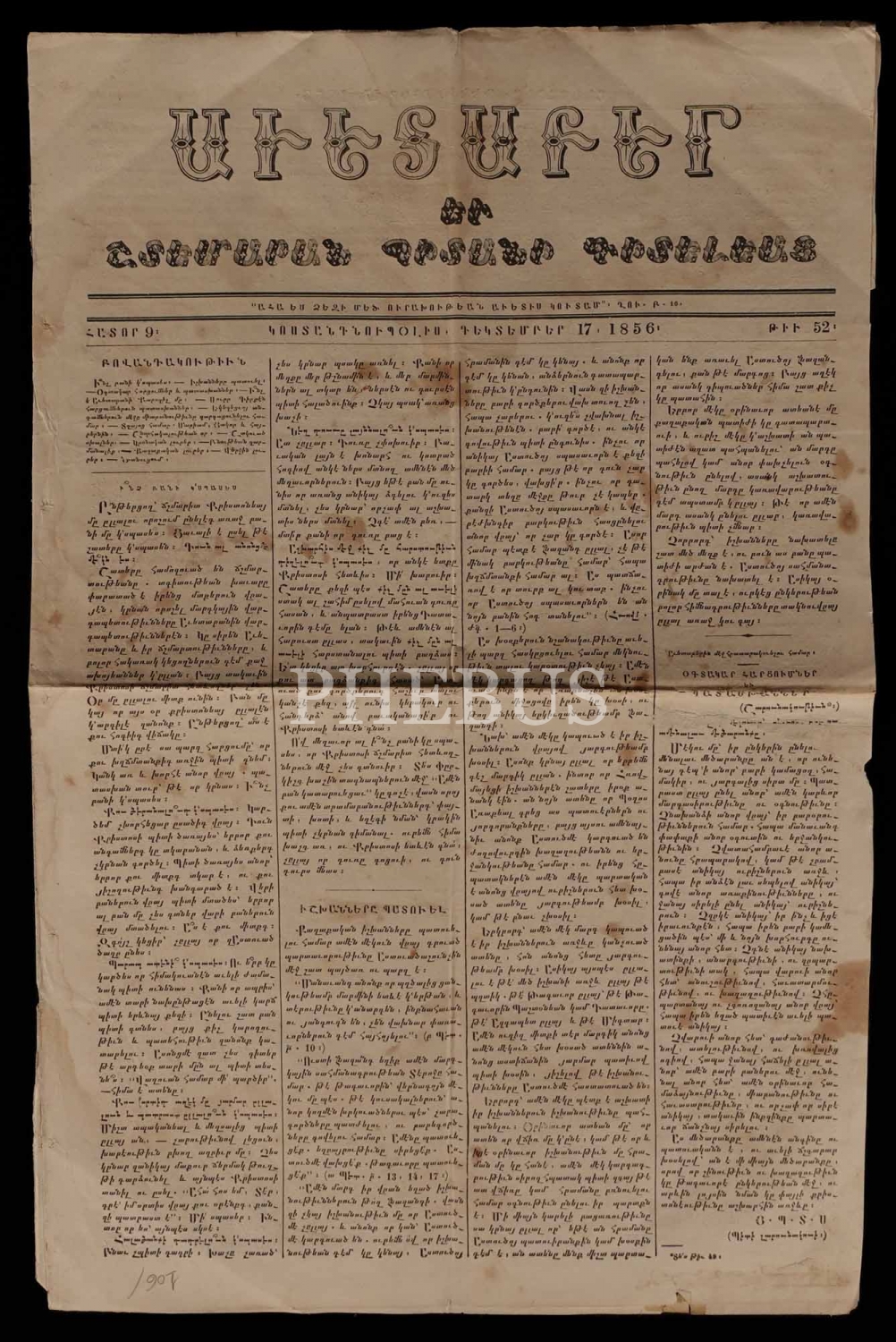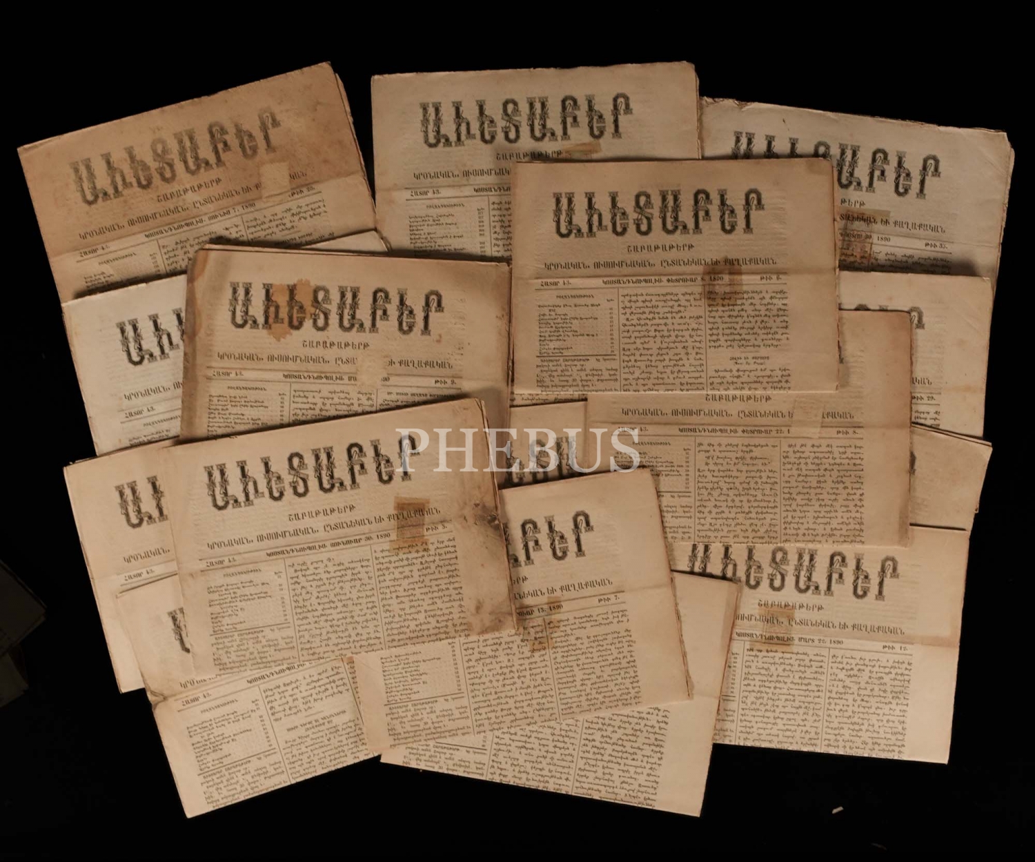 İstanbul´da 1855 ilâ 1890 seneleri arasında yayımlanan, Ermenice AVEDEPAR gazetesinin 26 adet nüshası, 29x41 cm...