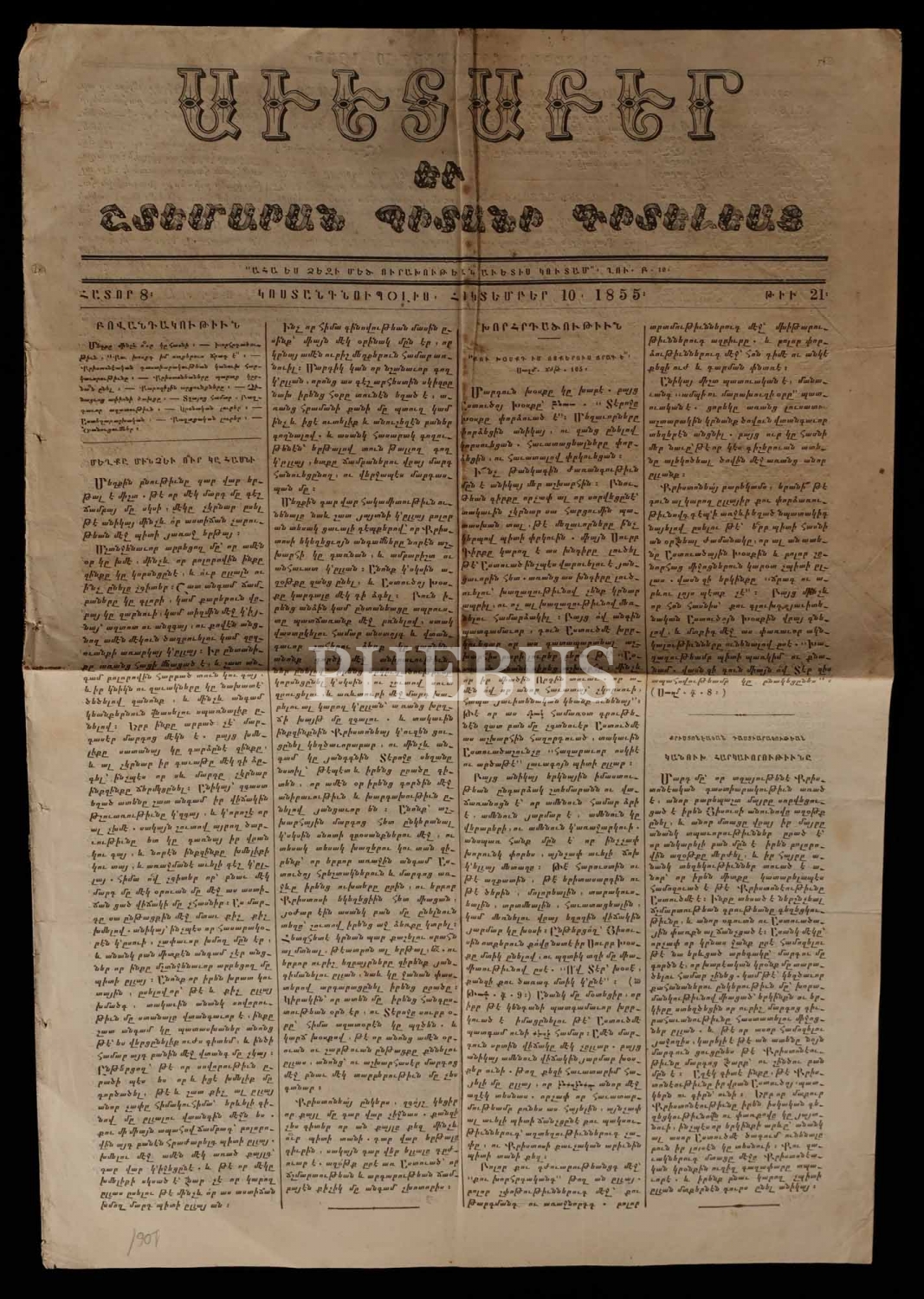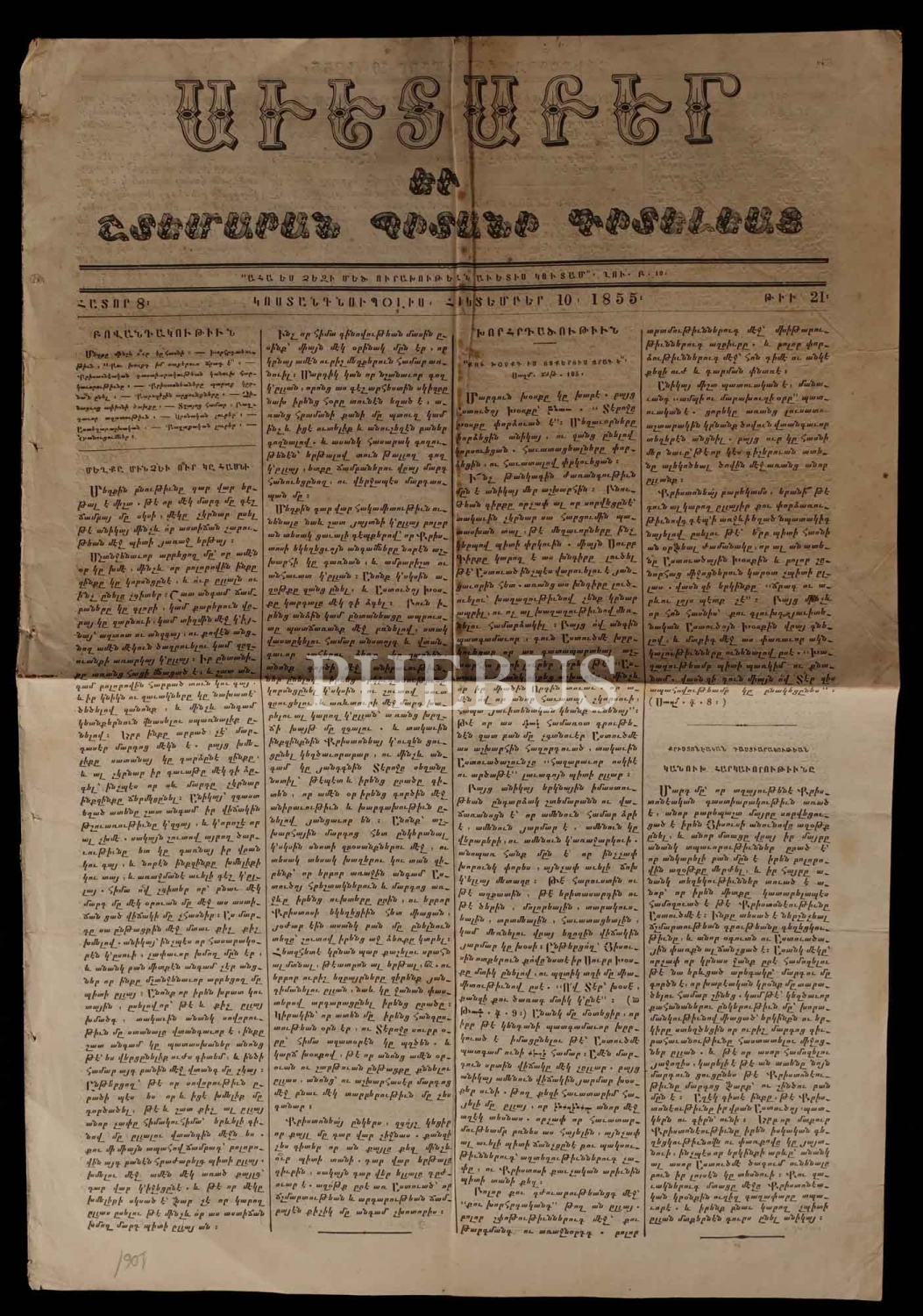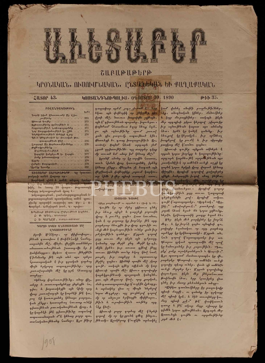 İstanbul´da 1855 ilâ 1890 seneleri arasında yayımlanan, Ermenice AVEDEPAR gazetesinin 26 adet nüshası, 29x41 cm...