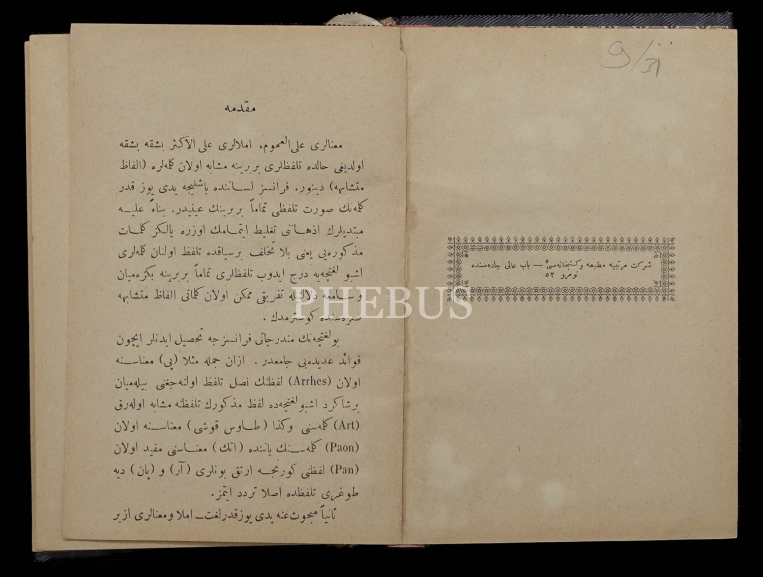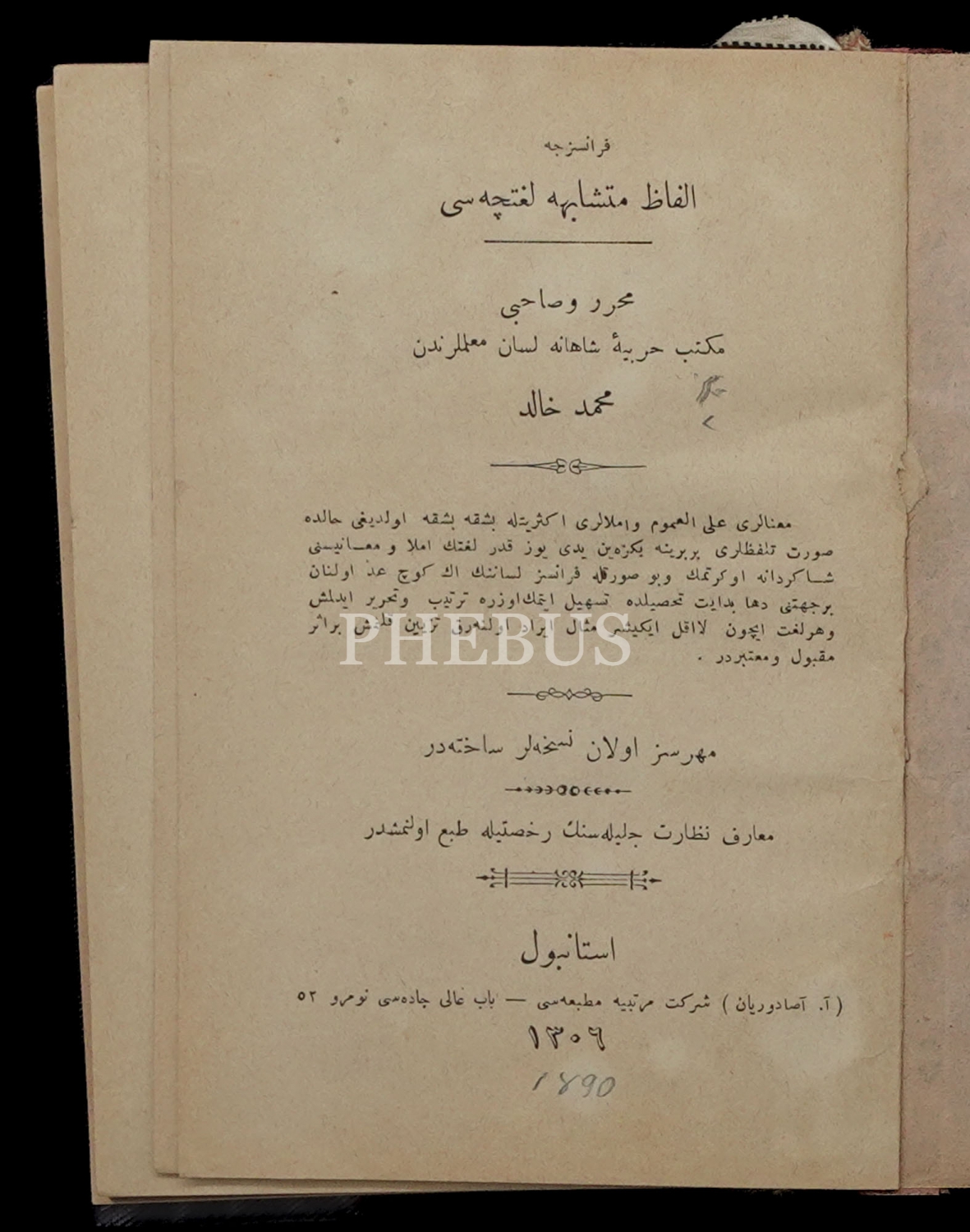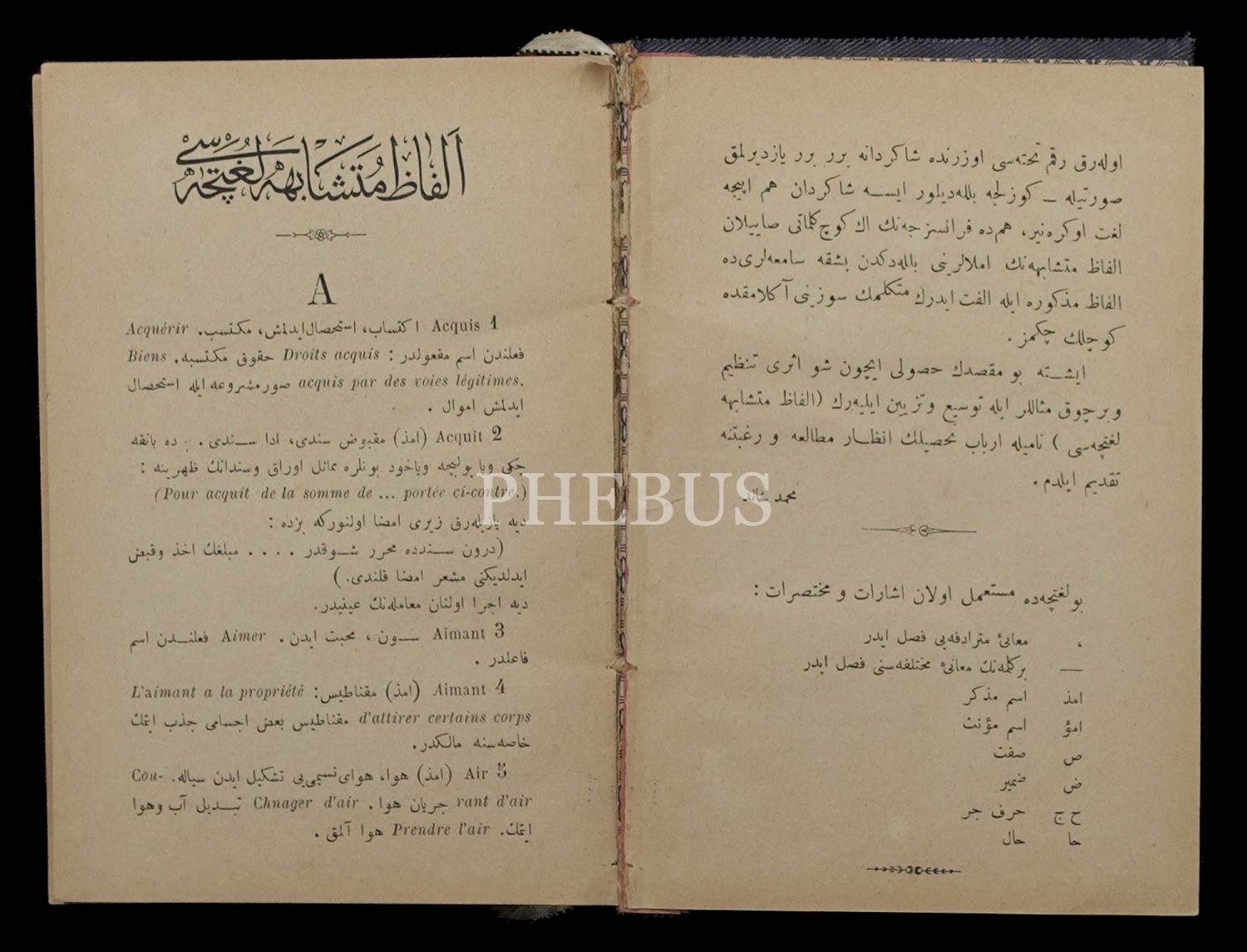 FRANSIZCA ELFAZ-I MÜTEŞABİHE LUGATÇESİ, Mehmed Halid, 1306, Artin Asaduryan Şirket-i Mürettibiye Matbaası, 159 sayfa, 12x17 cm...