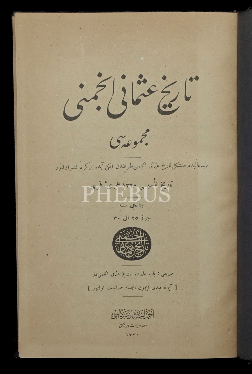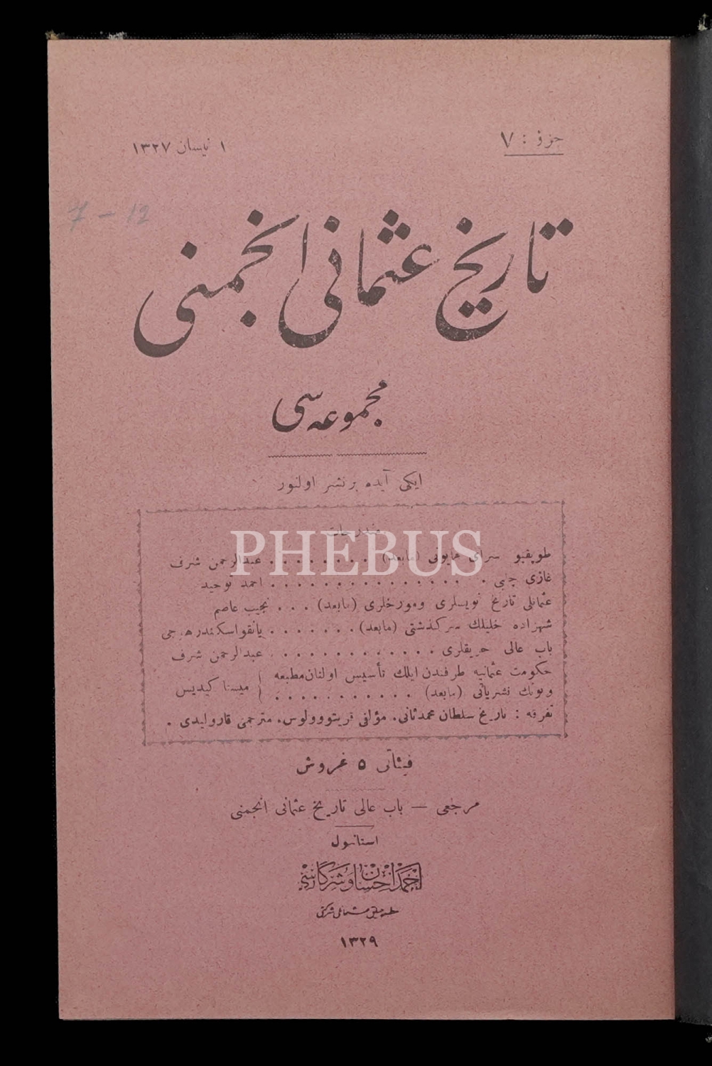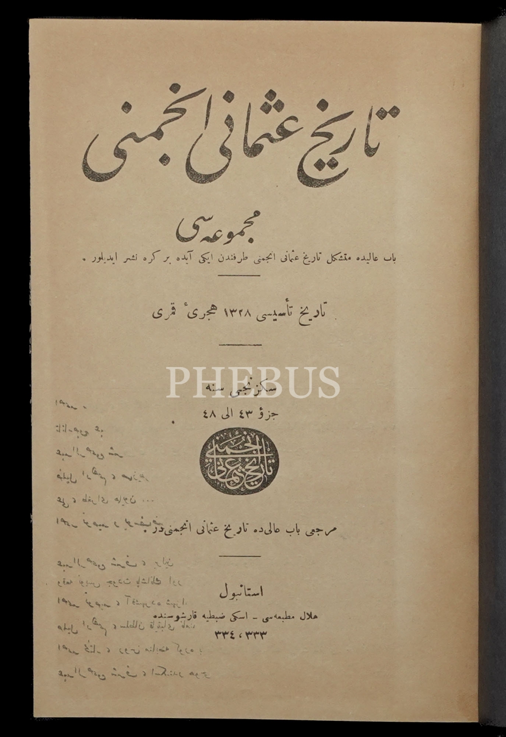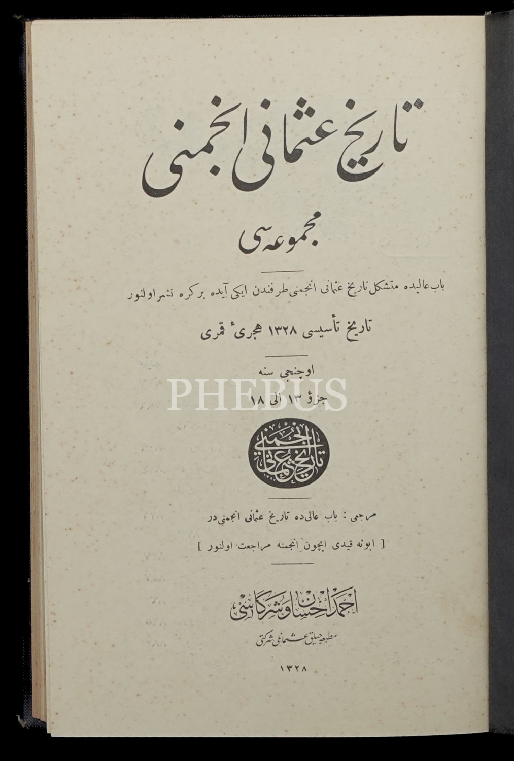 TÂRÎH-i OSMÂNÎ ENCÜMENİ MECMUASI'nın 1326-1336 yılları arasında yayımlanan 50 sayısı (1-49 sıralı, 77 müstakil), TÜRK TARİH ENCÜMENİ MECMUASI'nın 1340-1341 yılları arasında yayımlanan ilk 12 sayısı ve "TARİH ENCÜMENİ İLAVELERİ"nden oluşan lot, Ahmed İhsan ve Şürekâsı Matbaası, 16x23 cm...
