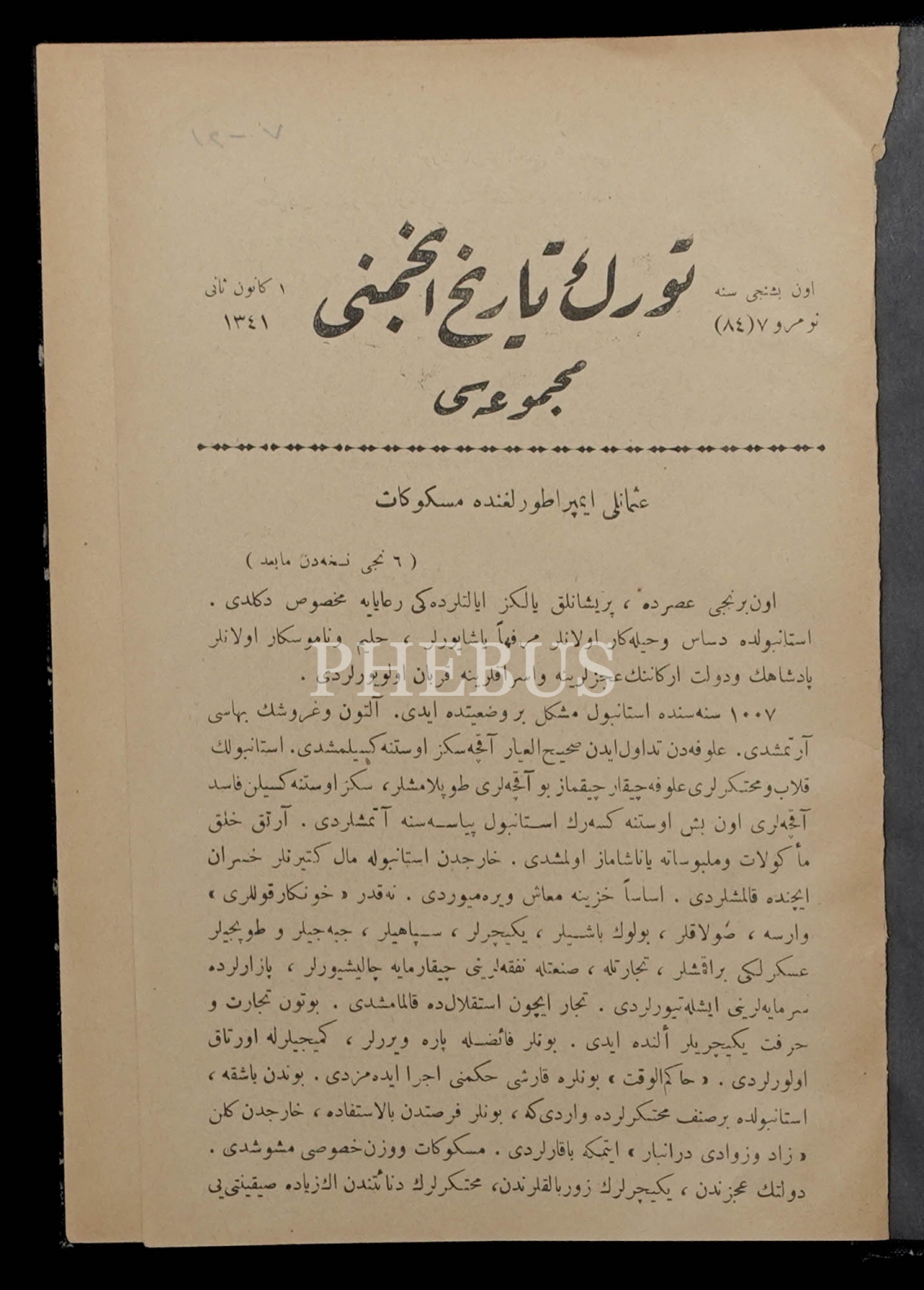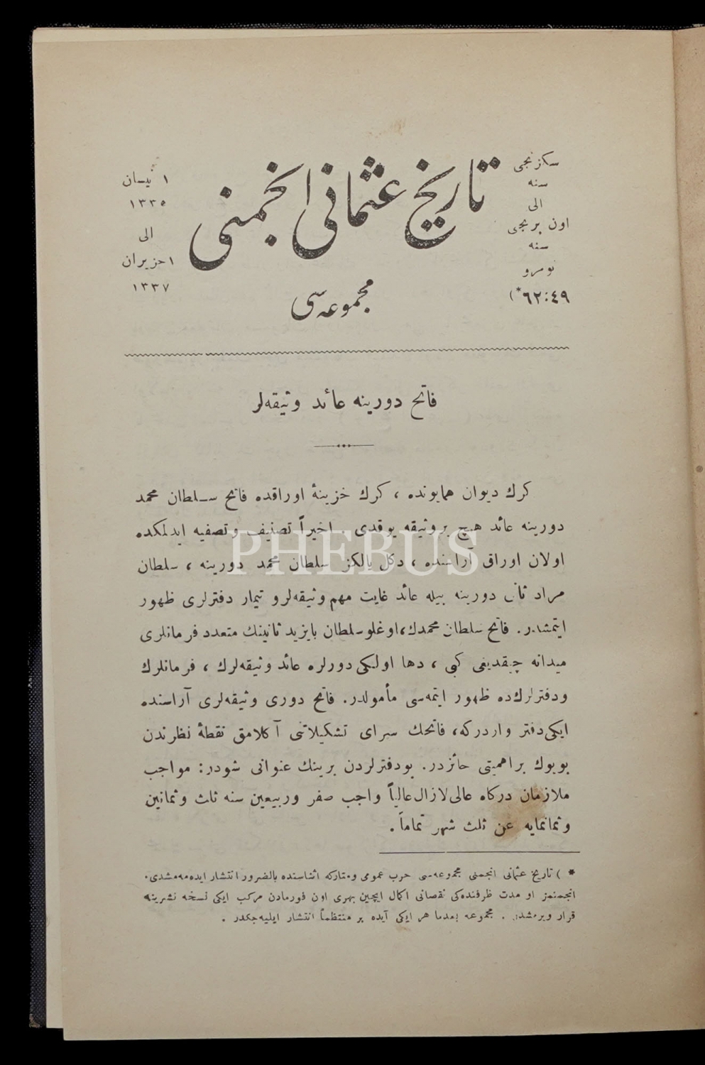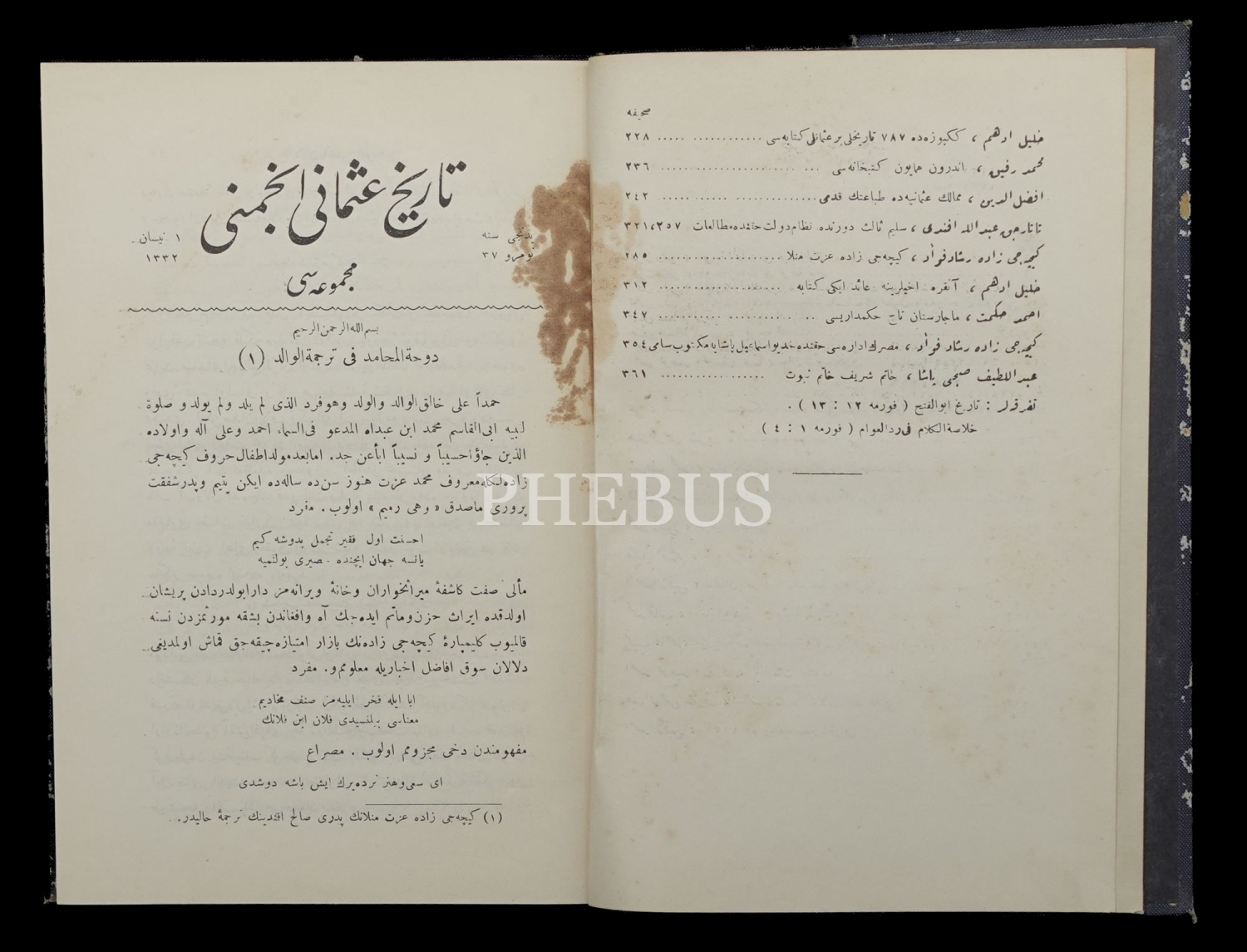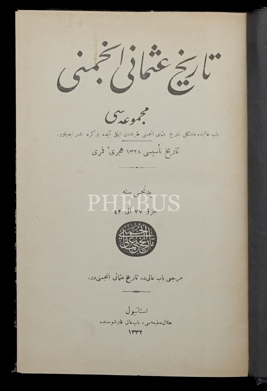 TÂRÎH-i OSMÂNÎ ENCÜMENİ MECMUASI'nın 1326-1336 yılları arasında yayımlanan 50 sayısı (1-49 sıralı, 77 müstakil), TÜRK TARİH ENCÜMENİ MECMUASI'nın 1340-1341 yılları arasında yayımlanan ilk 12 sayısı ve "TARİH ENCÜMENİ İLAVELERİ"nden oluşan lot, Ahmed İhsan ve Şürekâsı Matbaası, 16x23 cm...