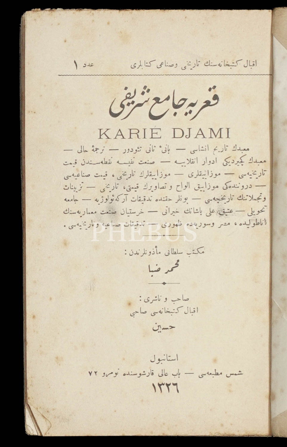 KA´RİYE CAMİ-İ ŞERÎFİ, Mehmed Ziya, 1326, Şems Matbaası, İkbal Kütübhanesi Sahibi Hüseyin, 119 sayfa, 12x18 cm...