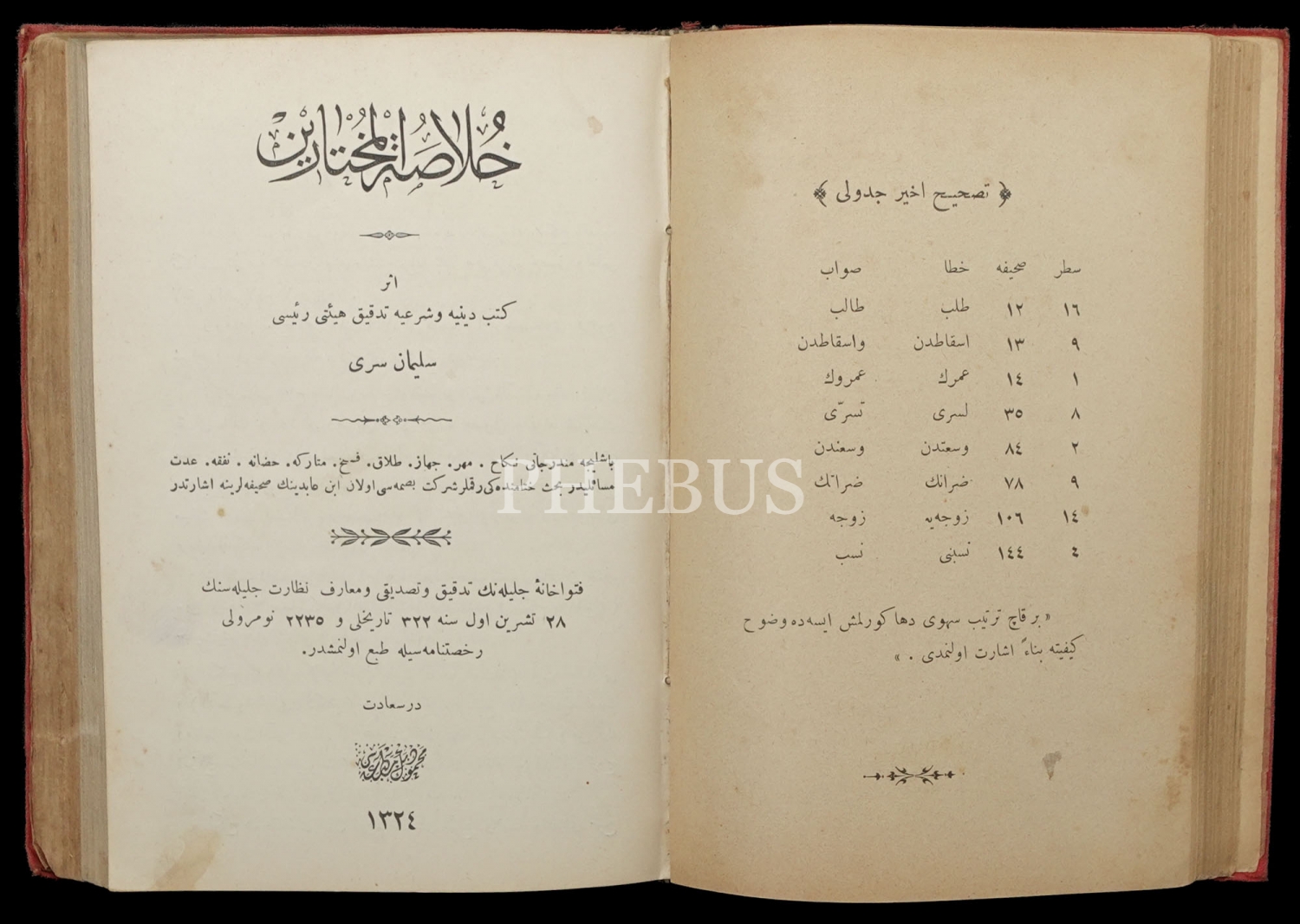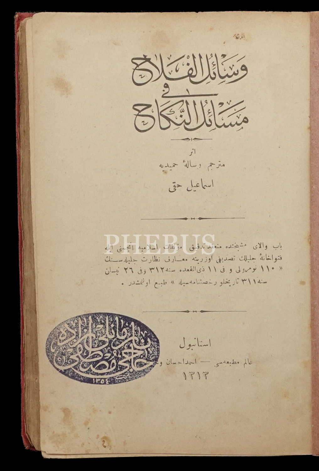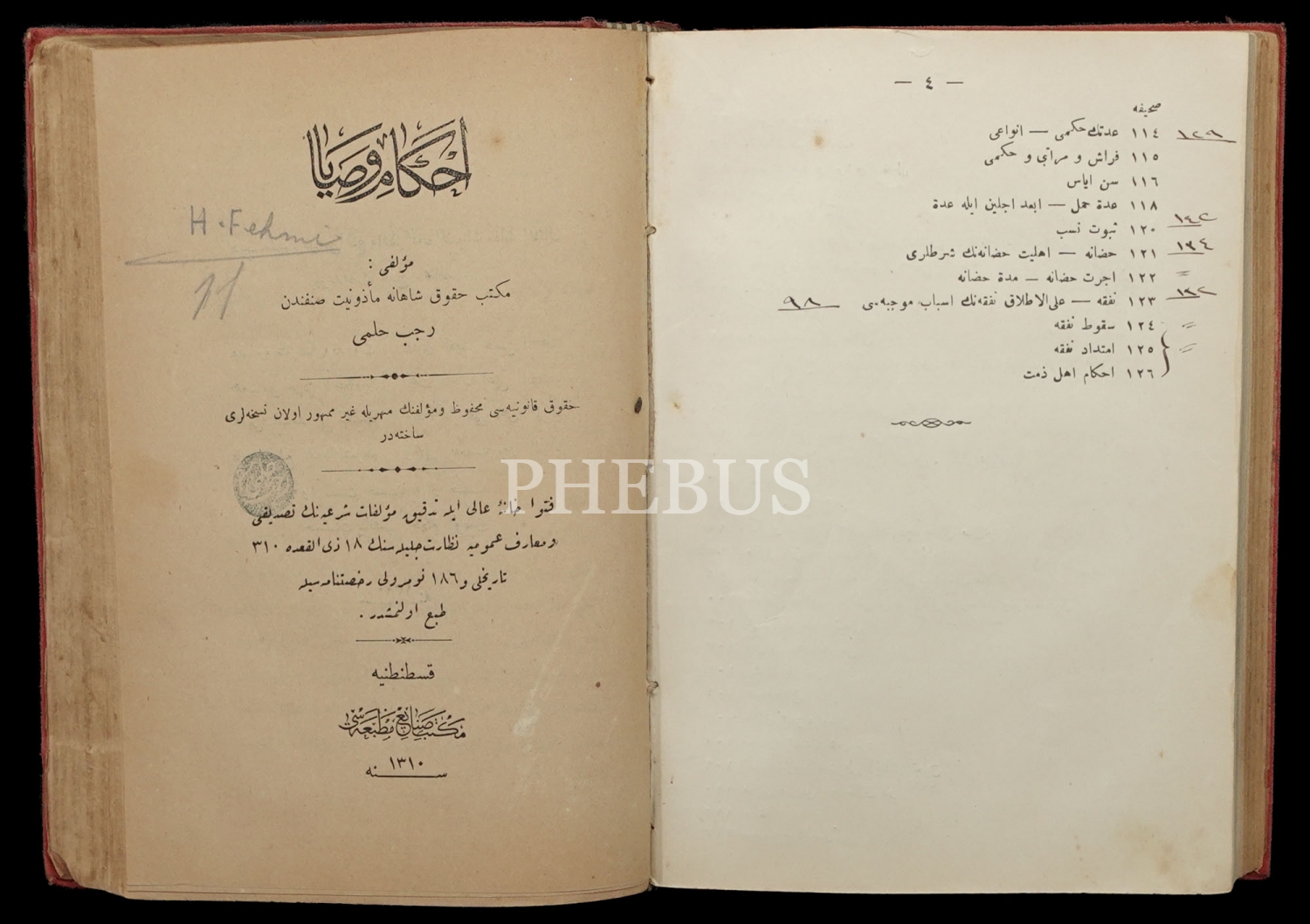 VESÂİLÜ´L-FELÂH FÎ MESÂİLİ´L-NİKÂH, Manastırlı İsmail Hakkı,1313, Âlem Matbaası, 151 sayfa, "HÛLÂSATÜ´L-MUHTAREYN, Süleyman Sırrı, 1324, Mahmud Bey Matbaası, 126 sayfa, AHKÂM-I VESÂYA, Receb Hilmi, 1315, Mekteb-i Sultani Matbaası, 189 sayfa, 14x20 cm...