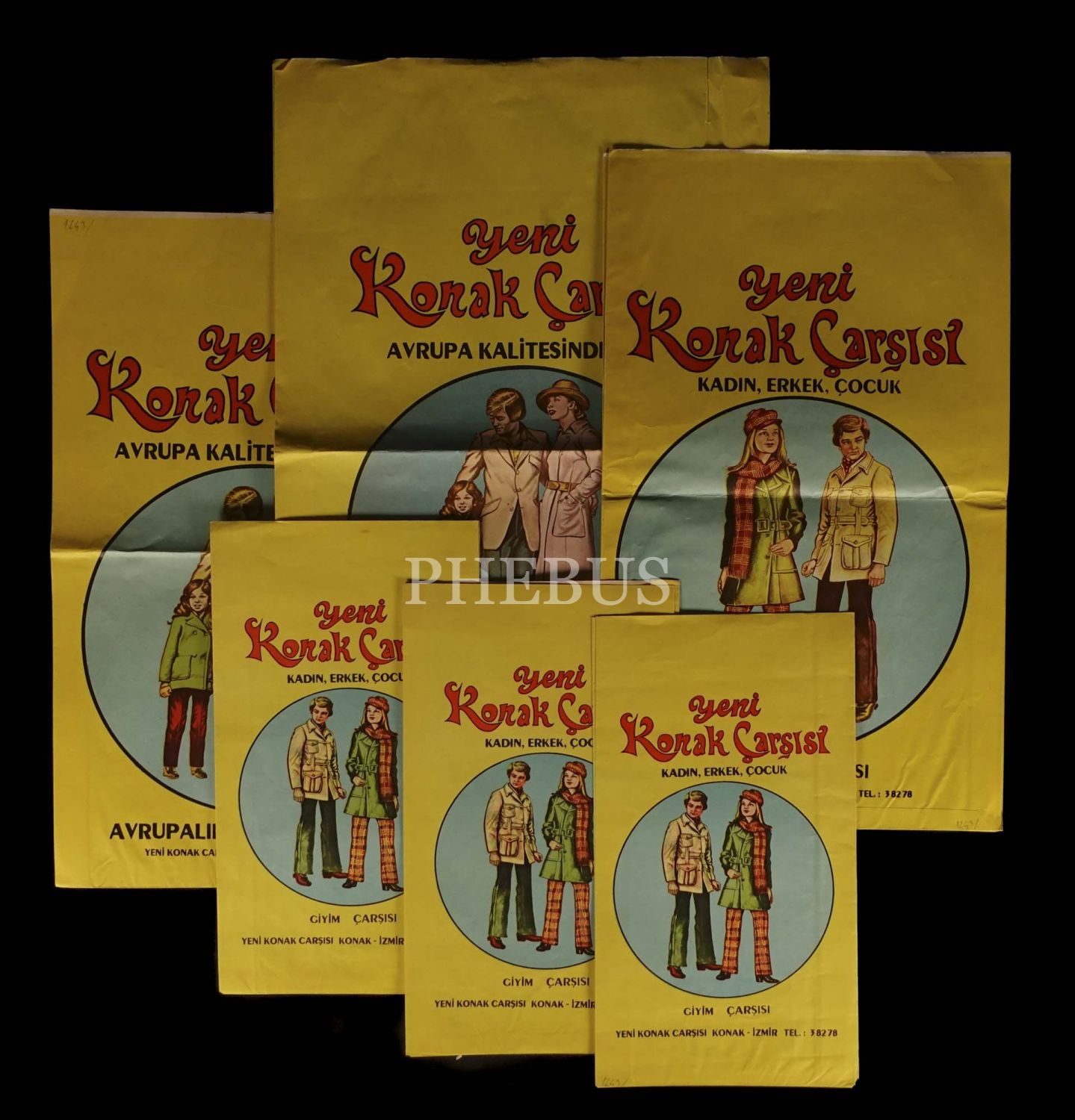 "Avrupalılar Gibi Alışveriş / Avrupa Kalitesinde Eşya" sloganlı Yeni Konak Çarşısı (Giyim Çarşısı) kese ambalajları, toplam altı adet, muhtelif ebatlarda...