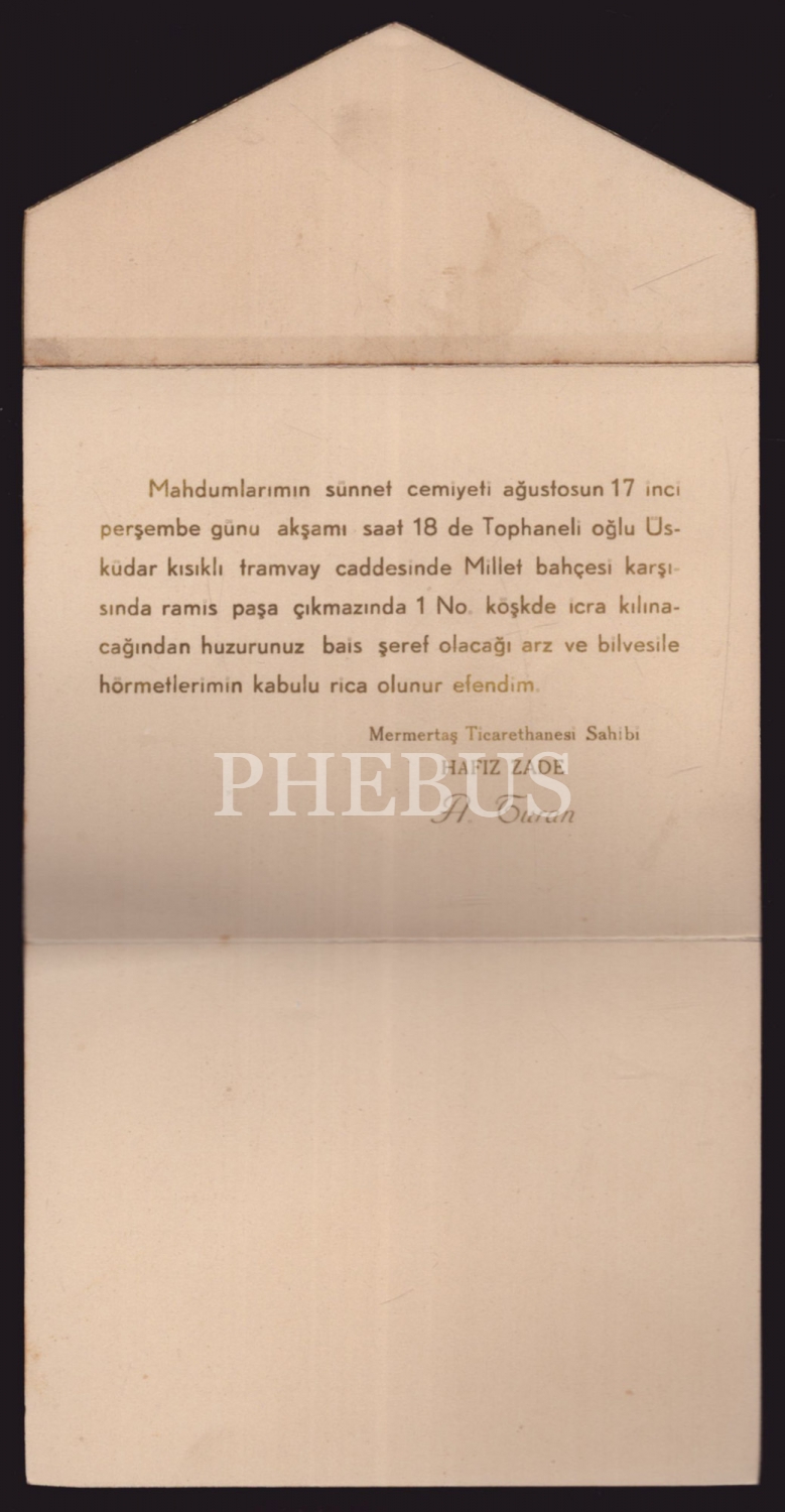 "Mahdumlarımın sünnet cemiyeti ağustosun 17 inci perşembe günu akşamı saat 18 de Tophaneli oğlu Üsküdar kısıklı tramvay caddesinde Millet bahçesi karşısında ramis paşa çıkmazında 1 No. köşkde icra kılınacağından huzurunuz bais şeref olacağı arz ve bilvesile hörmetlerimin kabulu rica olunur efendim."