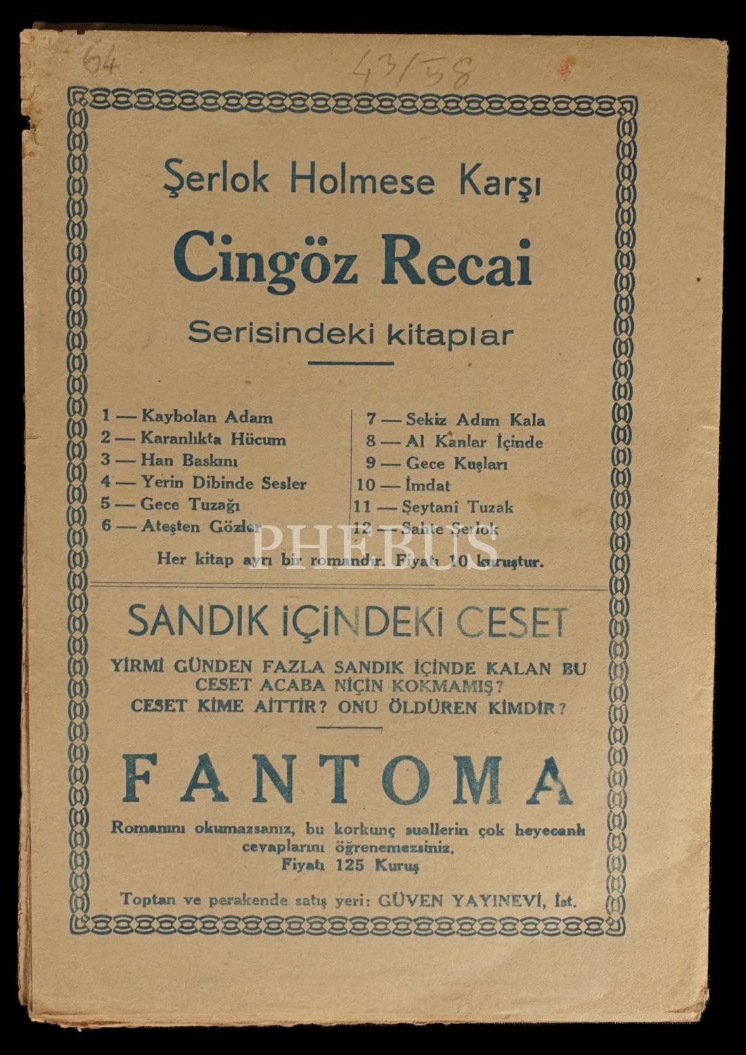 ŞERLOK HOLMESE KARŞI CİNGÖZ RECAİ 2: KARANLIKTA HÜCUM, (yazan: Server Bedi), 1944, Güven Yayınevi, 16 sayfa, 15x21 cm...