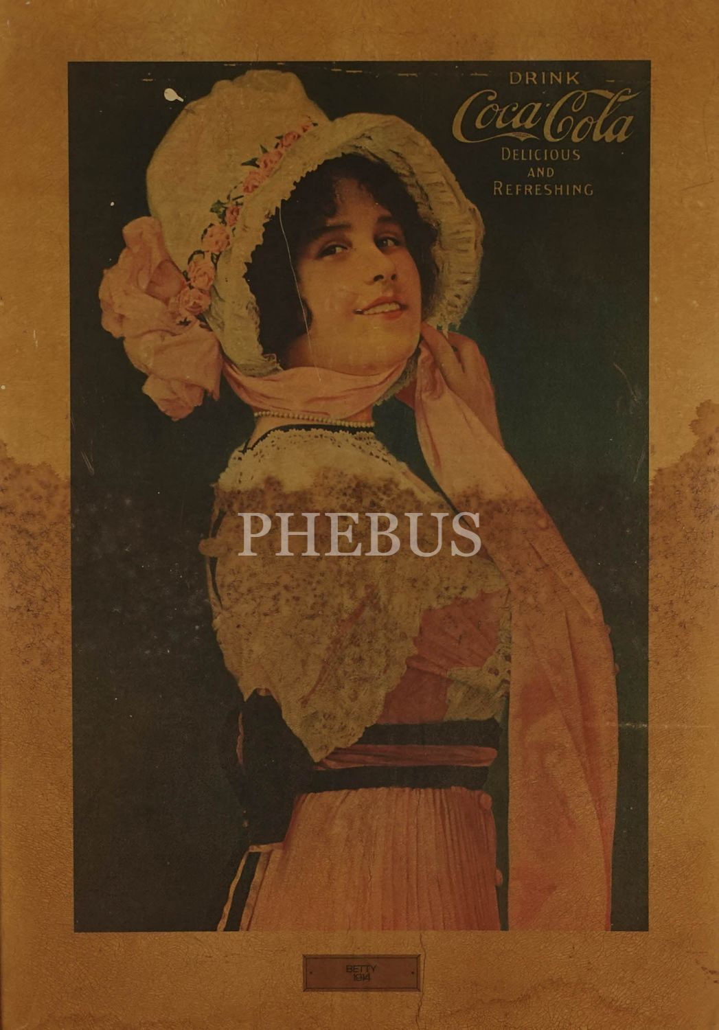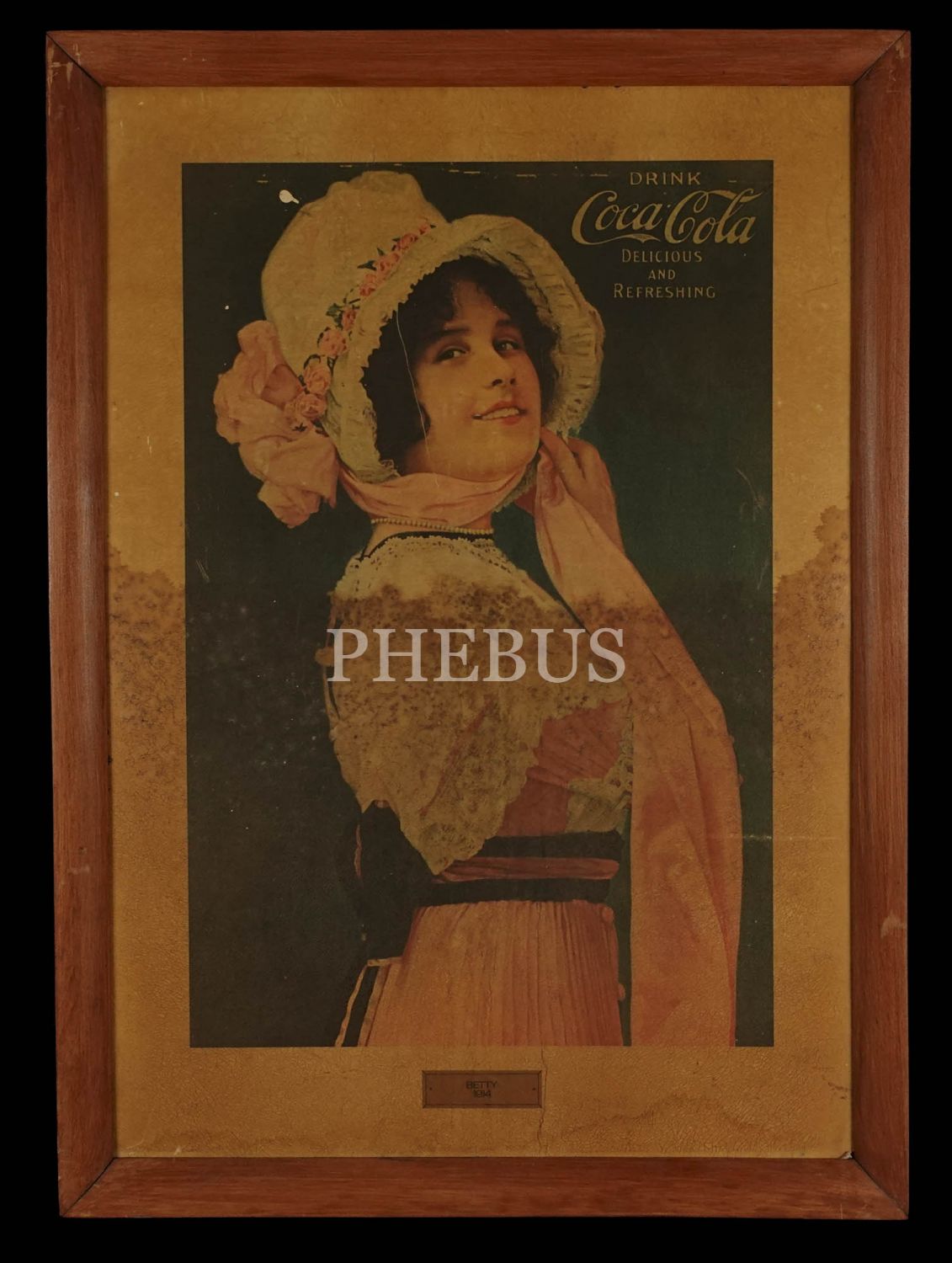 Coca-Cola´nın popüler reklam yüzlerinden "Betty" görselli ve 1914 tarihli reklam afişinin ahşap üzerine röprodüksiyon baskısı: "Drink Coca-Cola /Delicious and Refreshing", çerçevesiyle birlikte 50x69 cm...