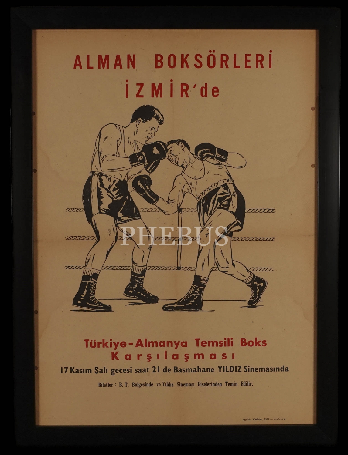 1959 yılında Yıldız Sineması´nda düzenlenen Türkiye-Almanya Temsili Boks Karşılaşması´nın duyuru afişi, Ayyıldız Matbaası (Ankara), çerçevesiyle birlikte 46x62 cm...
