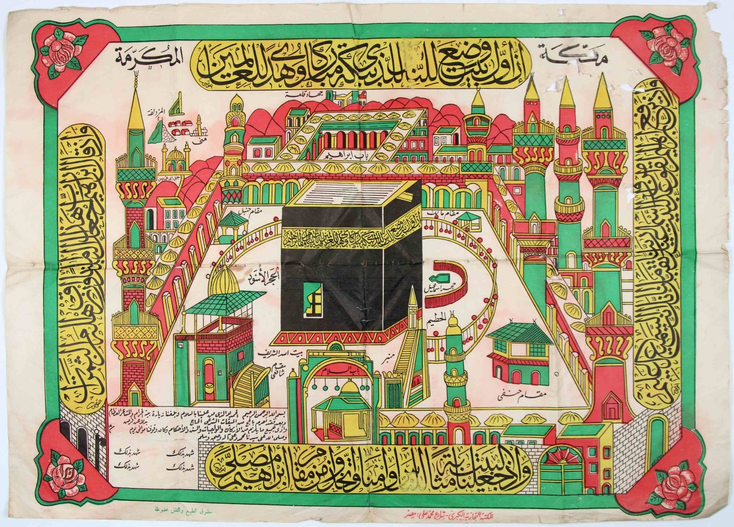 Mekke-i Mükerreme ve Kabe-i Şerif afiş, Arapça, haliyle, 56,5x40,5 cm.