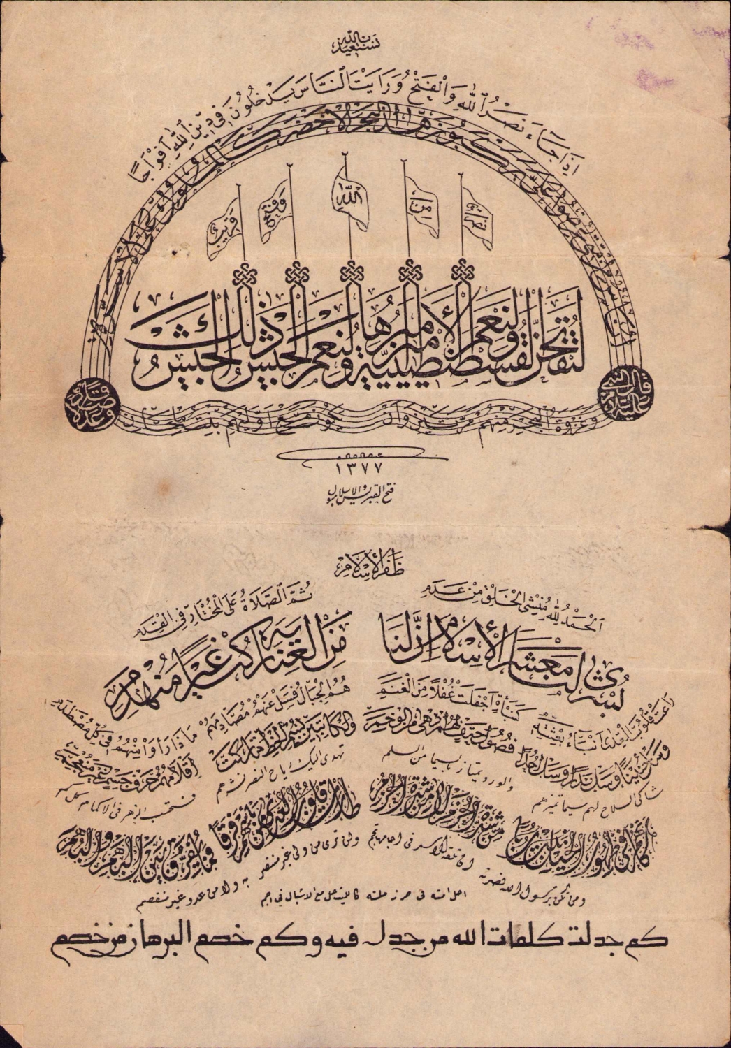 İstanbul'un fethiyle ilgili hadis-i şerif ve Fetih suresinden ayet-i kerimeler yazılı baskı levha, muhtelif yazı çeşitleriyle, 1377 tarihli, 17,5x24,5 cm.