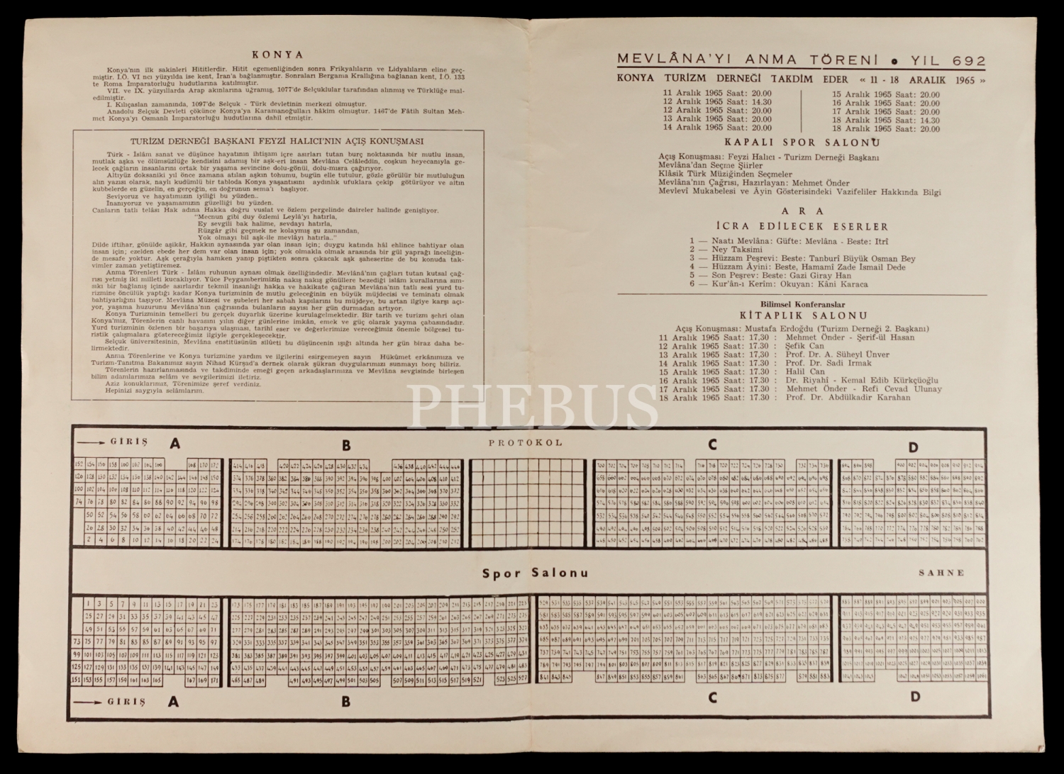 11-18 Aralık 1965 tarihinde Konya´da düzenlenen "Mevlâna´yı Anma Töreni"nin programı, Ayyıldız Matbaası, 22x32 cm...