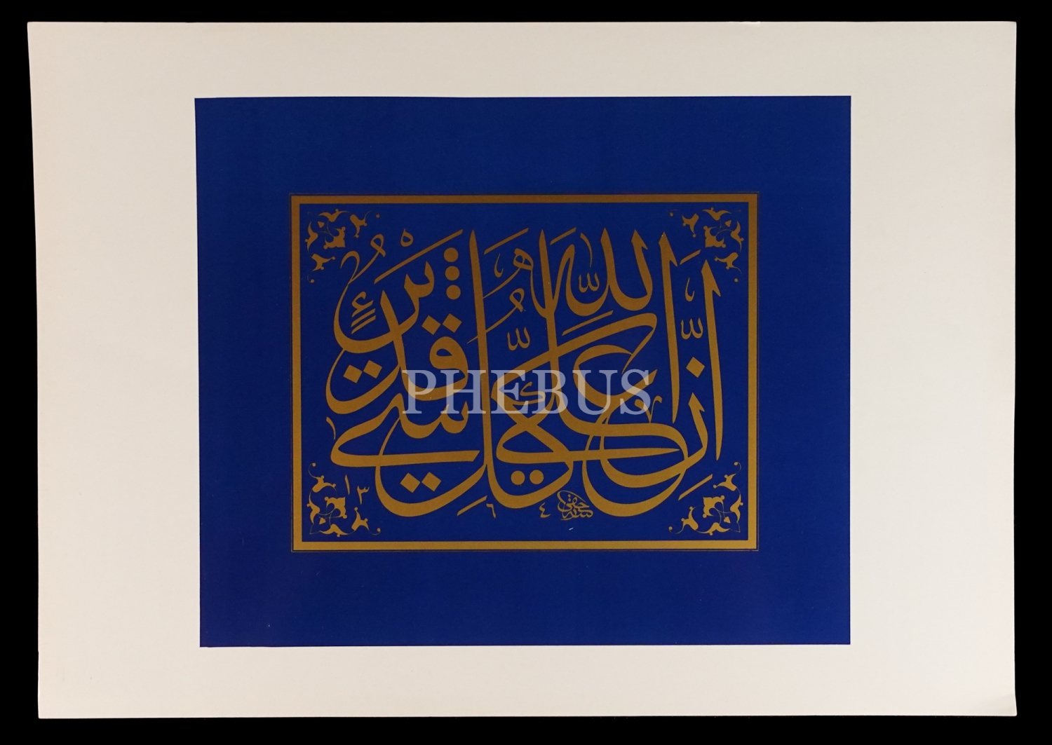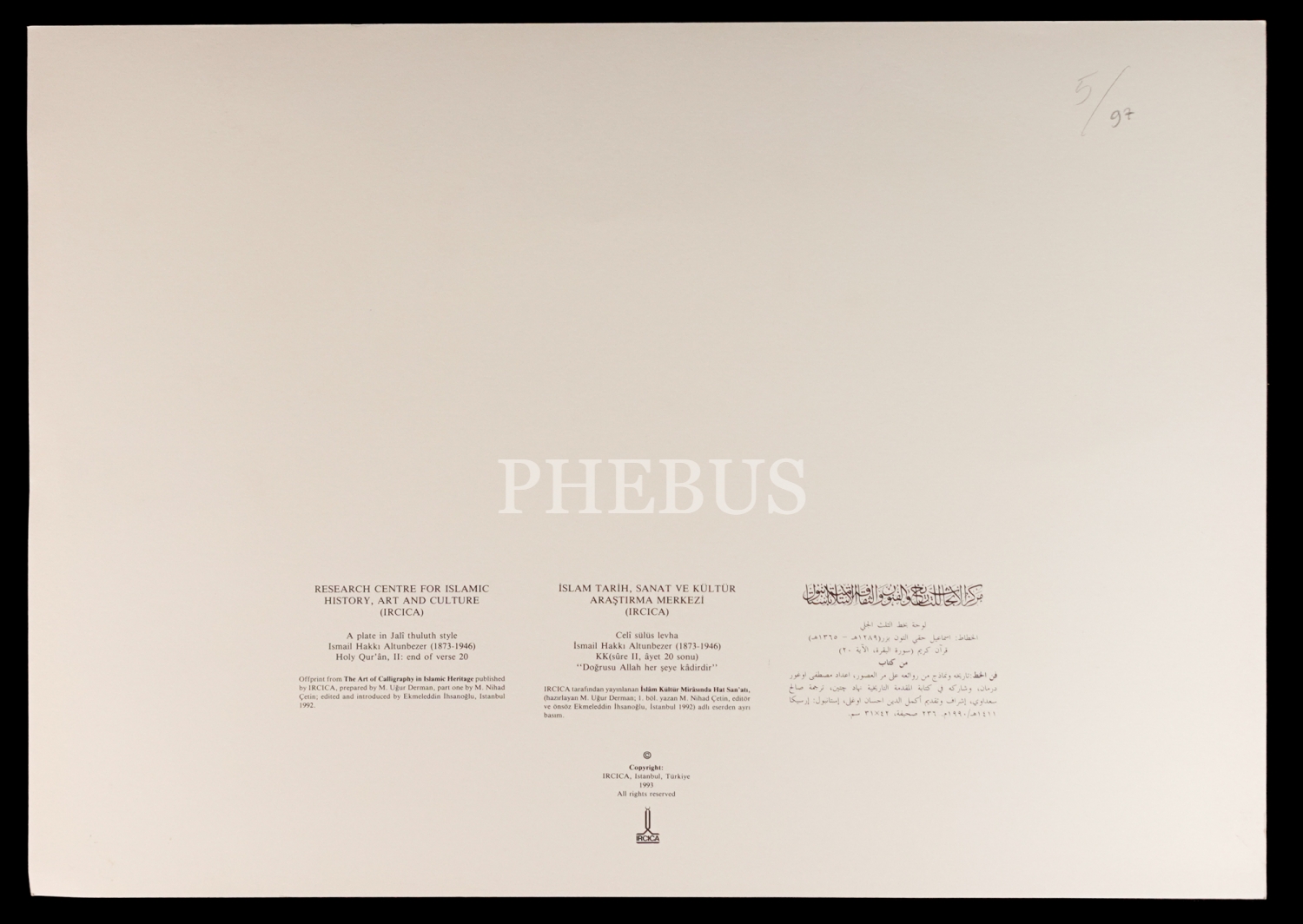 İsmail Hakkı Altunbezer ketebeli celi sülüs levha, İslam Tarih, Sanat ve Kültür Araştırma Merkezi (IRCICA) baskısı, 1993, 48x34 cm...