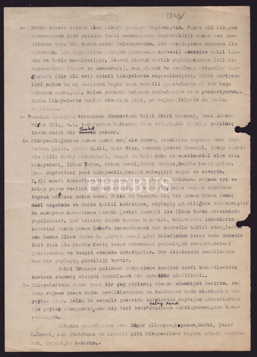 Türk tiyatrosunun Shakespeare’i olarak anılan Orhan Asena´nın Tahir Alangu´nun 15 soruluk anketine verdiği ıslak imzalı cevap mektupları, 1953 Diyarbakır-Ankara, 3 sayfa, 19x27 cm...