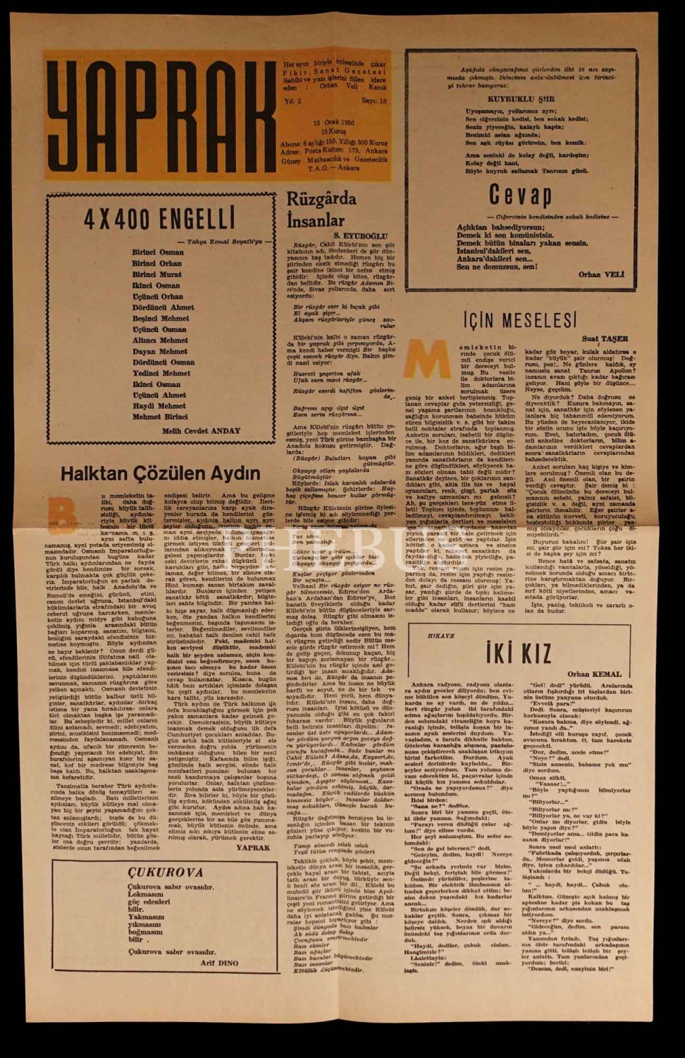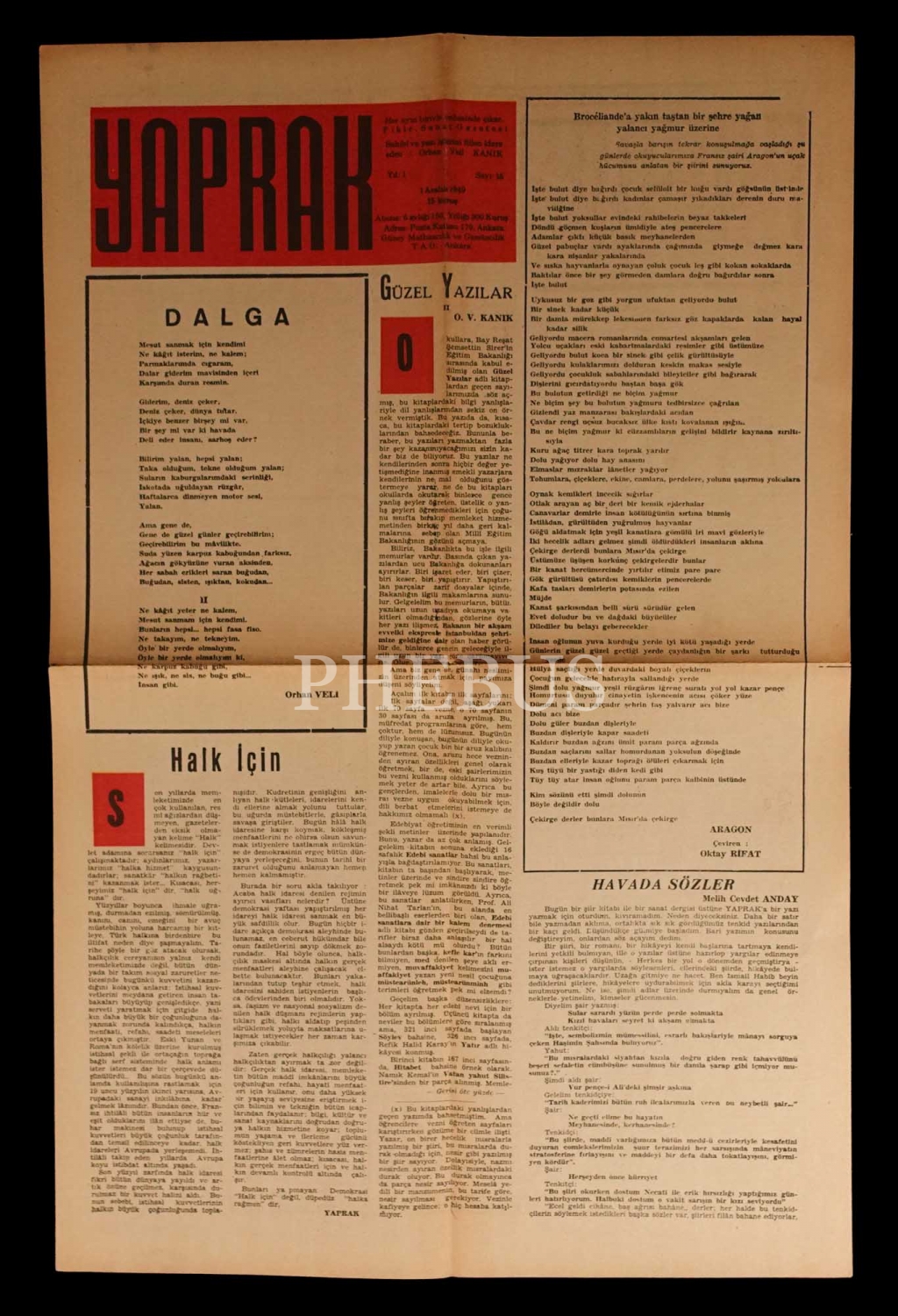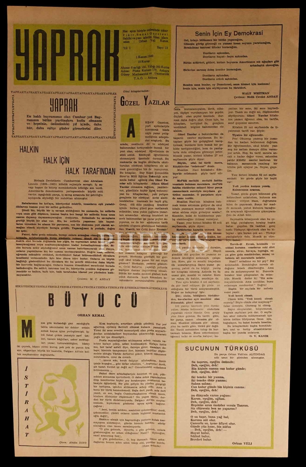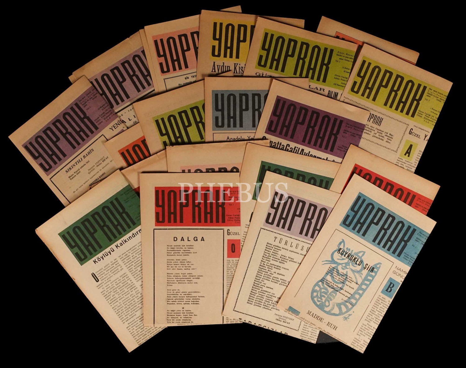 Orhan Veli Kanık tarafından çıkarılan, tek yapraklık "Fikir, Sanat Gazetesi" YAPRAK´ın 1949-50 yılları arasında yayımlanan nüshalarının tıpkıbasımları, 32x49 cm...