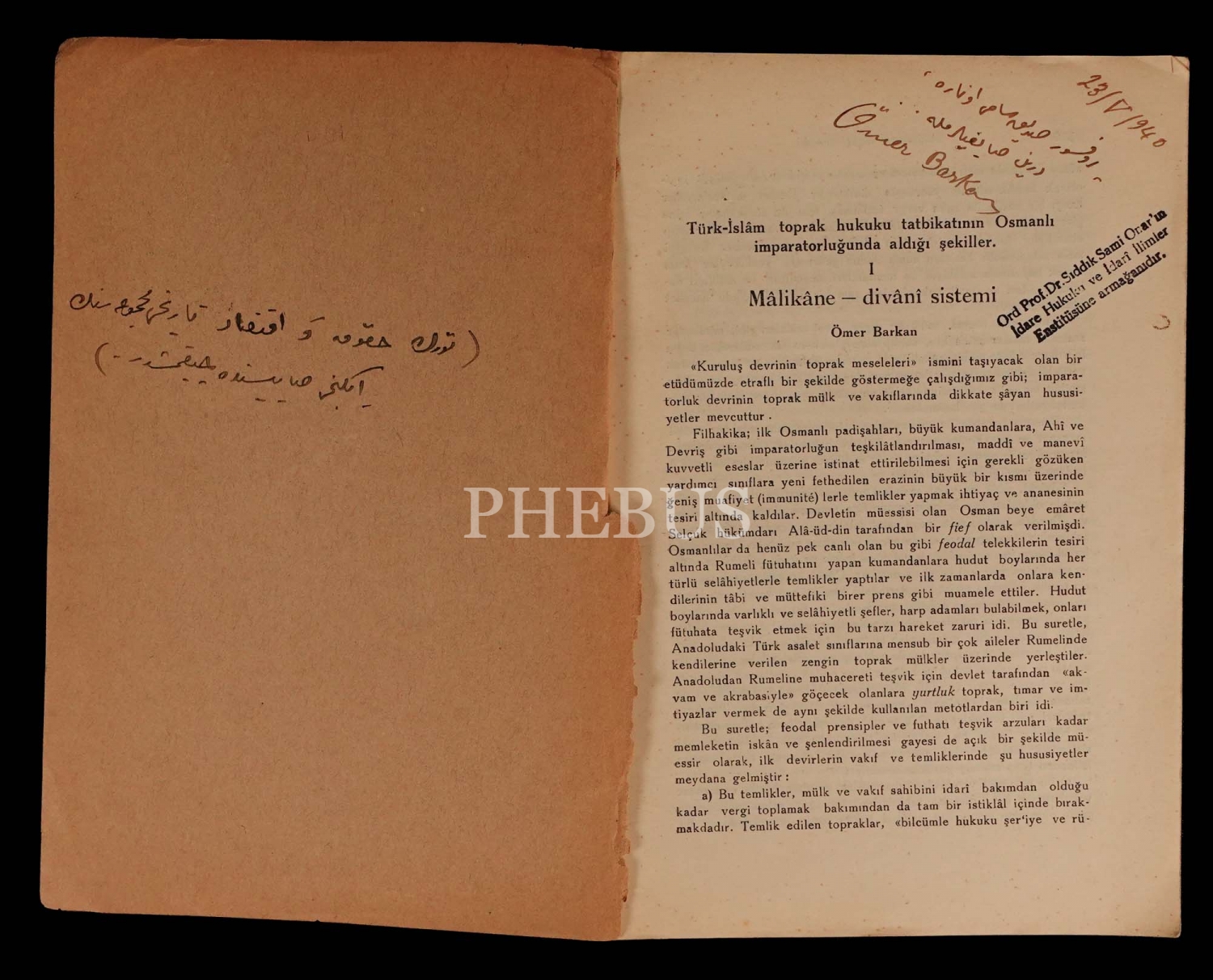 Ömer [lütfi] Barkan´dan "Profesör Sıddık Sami Onar´a derin saygılarımla..." 23.07.1940 ithaflıyla imzalıdır...