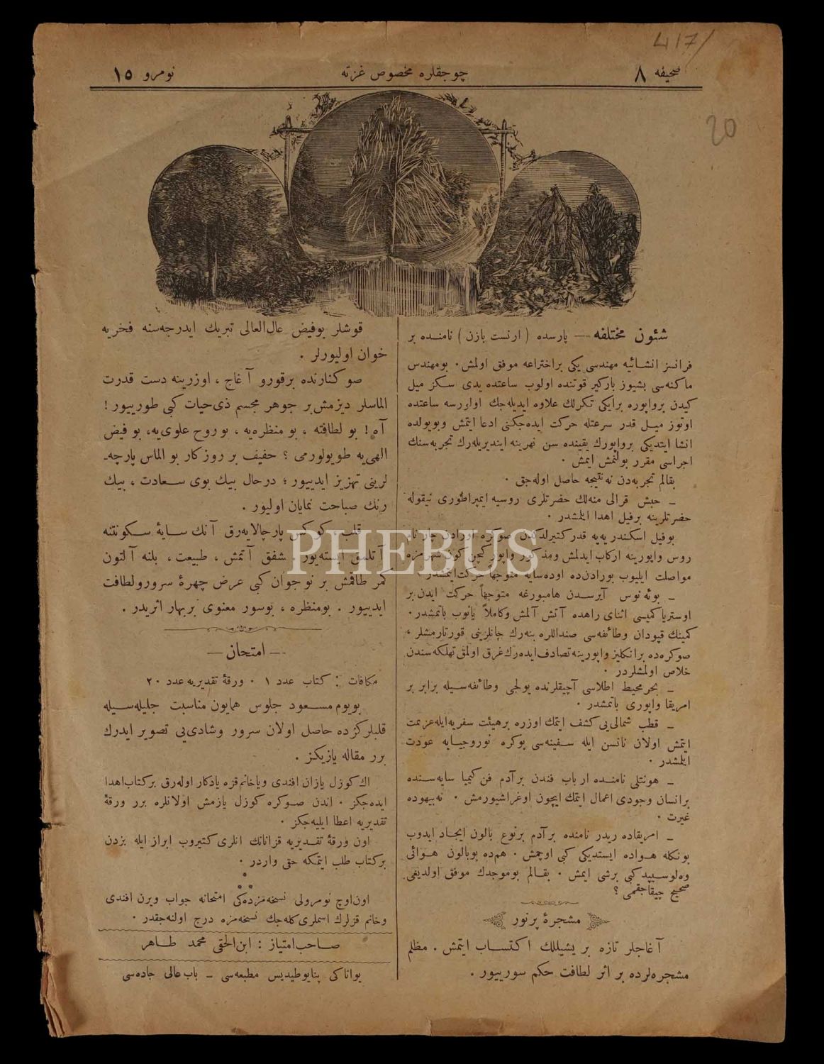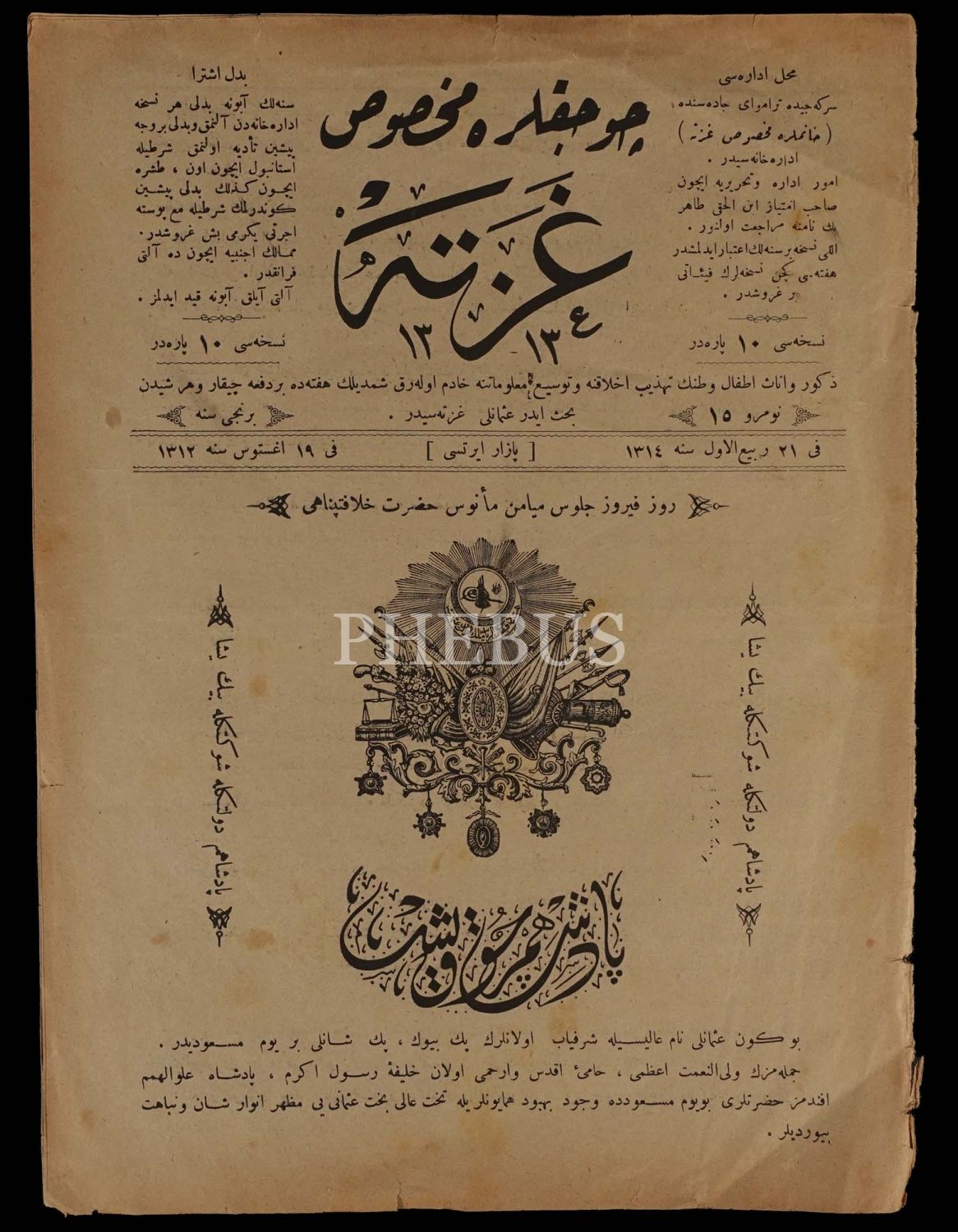 Sultan II. Abdülhamid´in tahta oturuşunun 20. senesini kutlayan kapağıyla ÇOCUKLARA MAHSUS GAZETE´nin 19 Ağustos 1312 tarihli nüshası, 20x27 cm...