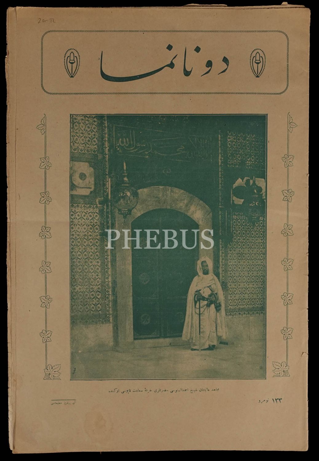Şeyh Ahmed es-Senûsî´nin Hırka-i Şerif Dairesi önünde alınan fotoğrafına kapağında yer veren DONANMA dergisinin 133. sayısı, 12 Eylül 1334, 26x38 cm...