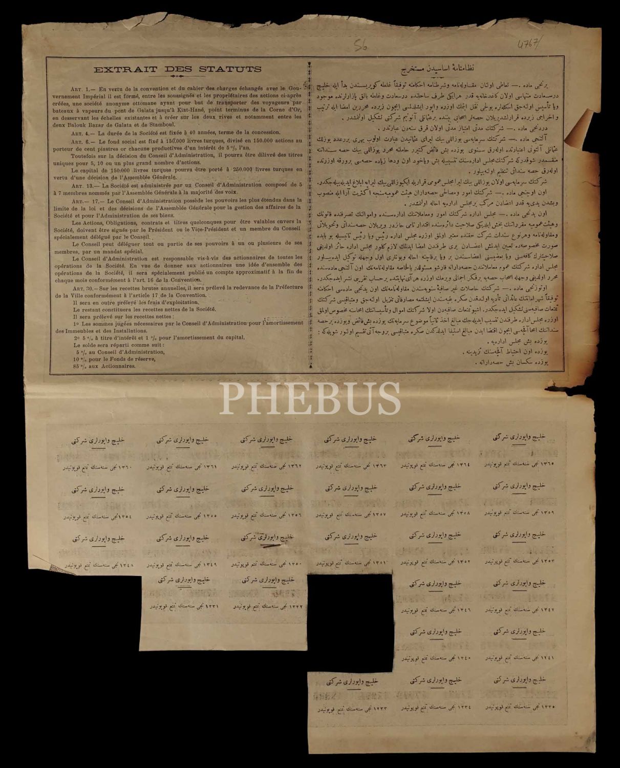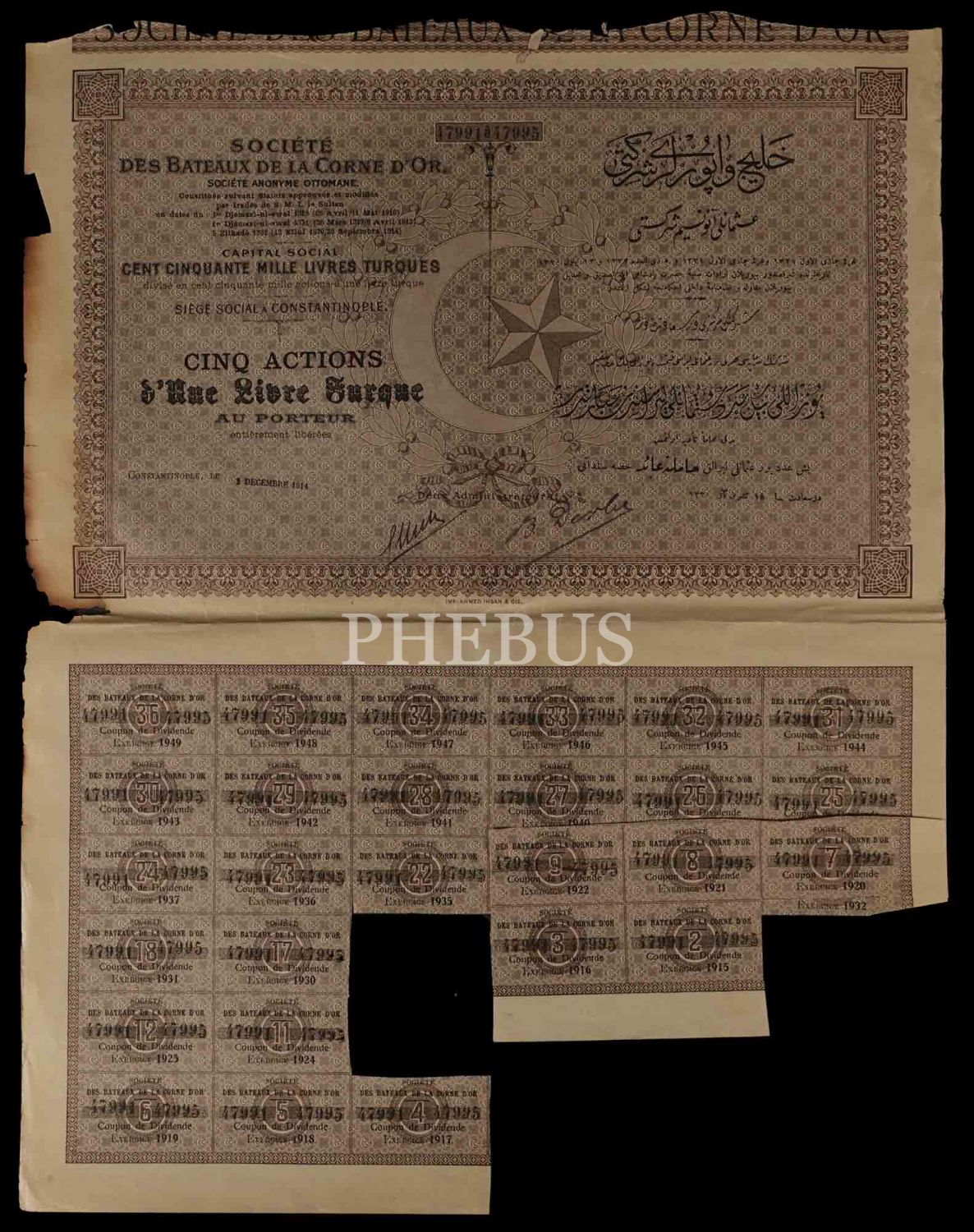 Haliç Vapurları Osmanlı A.Ş. hisse senedi, Osmanlıca-Fransızca yazılı, 1 Aralık 1914 damgalı, 37x24 cm...
