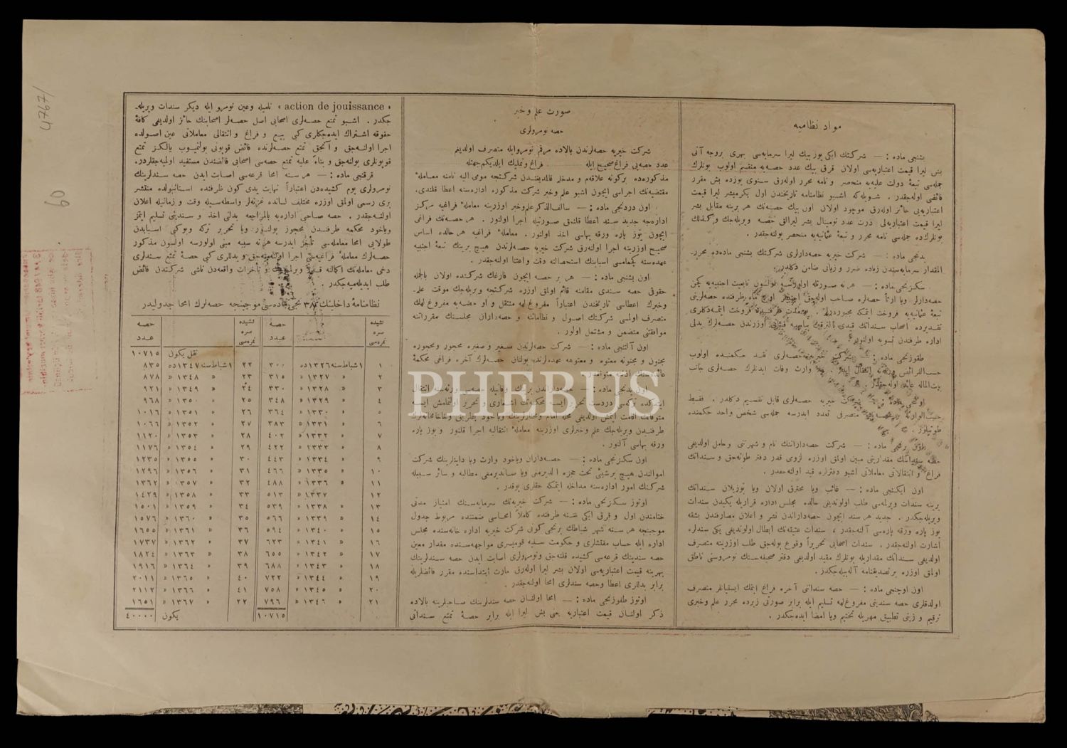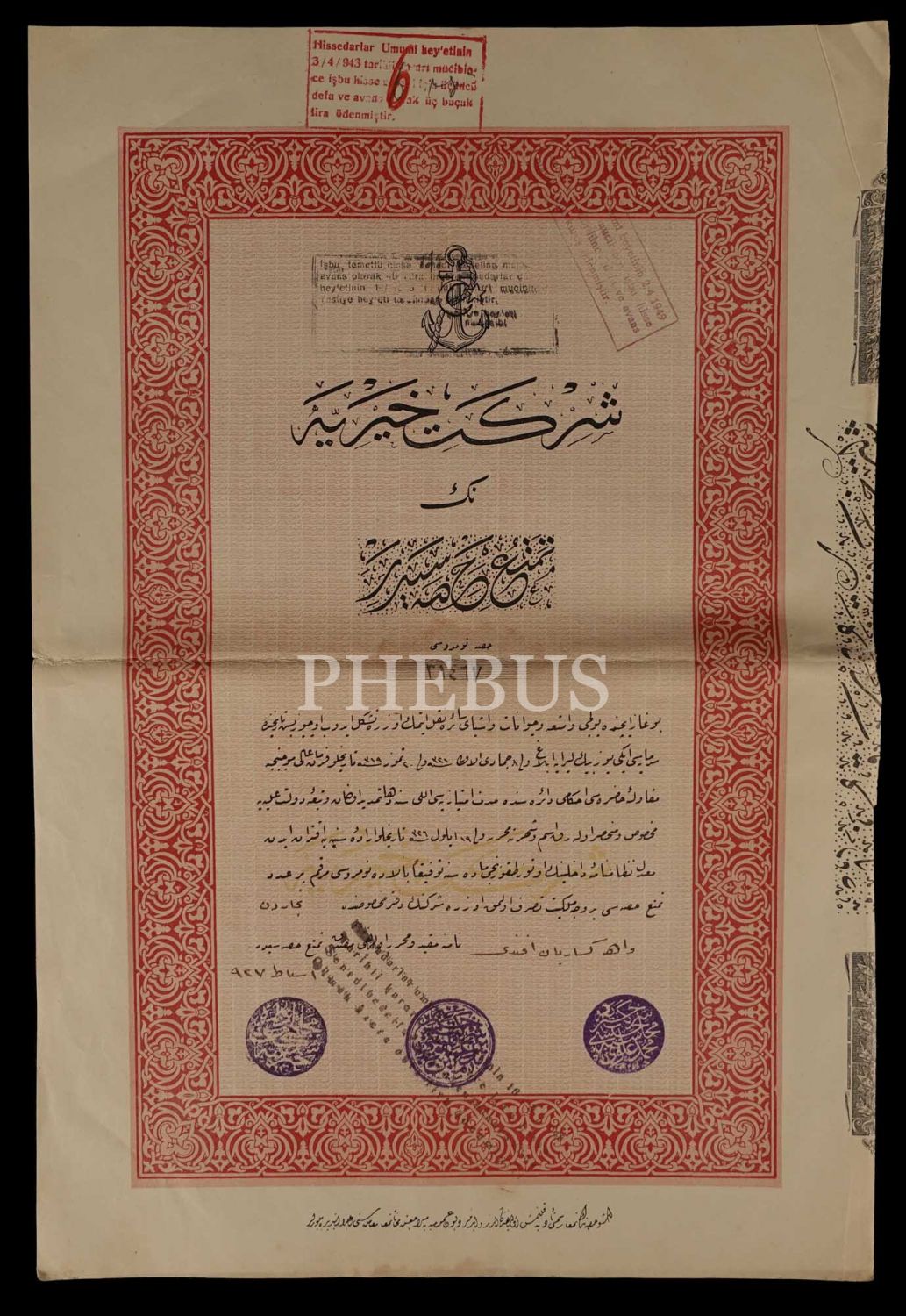 Osmanlıca Şirket-i Hayriye temettü hisse senedi (nama yazılmış), 27x40 cm...