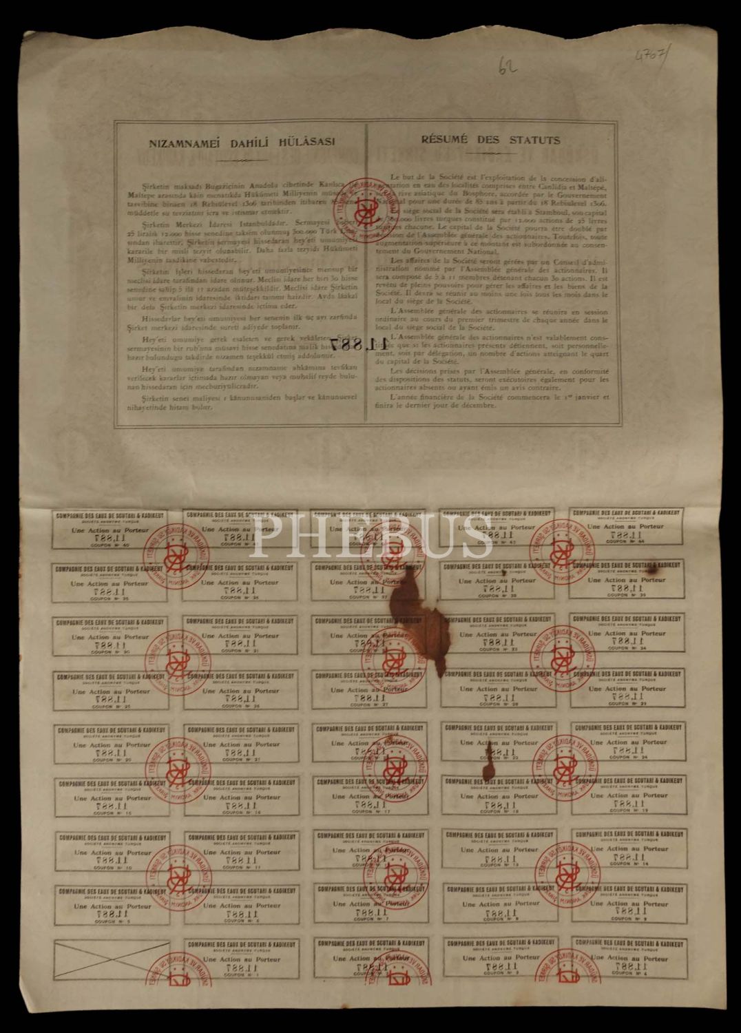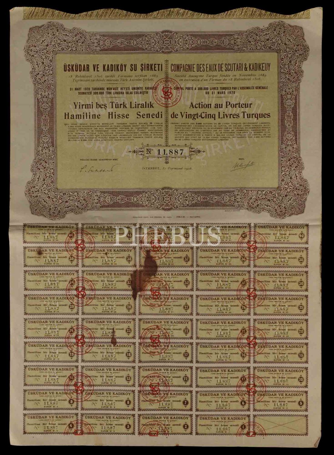 Üsküdar ve Kadıköy Su Şirketi 5 Liralık hisse senedi, Türkçe-Fransızca yazılı, 31 Teşrinievvel 1928 tarihli, 35x25 cm...