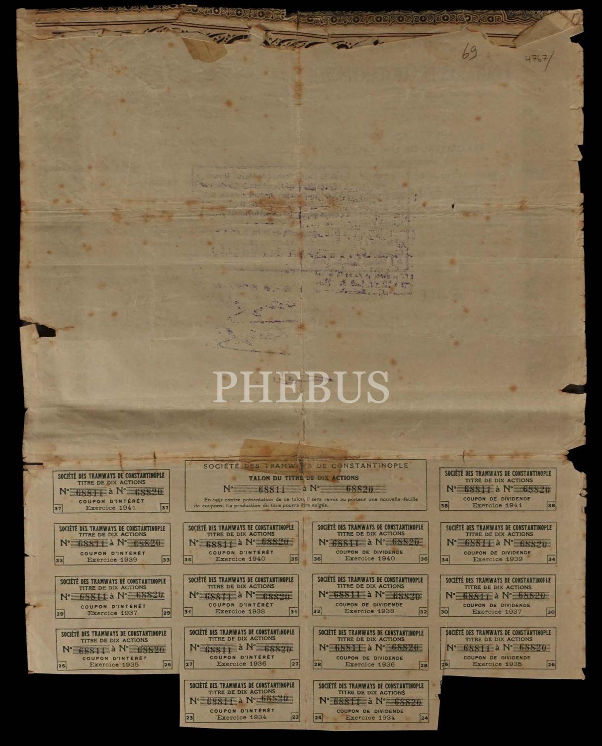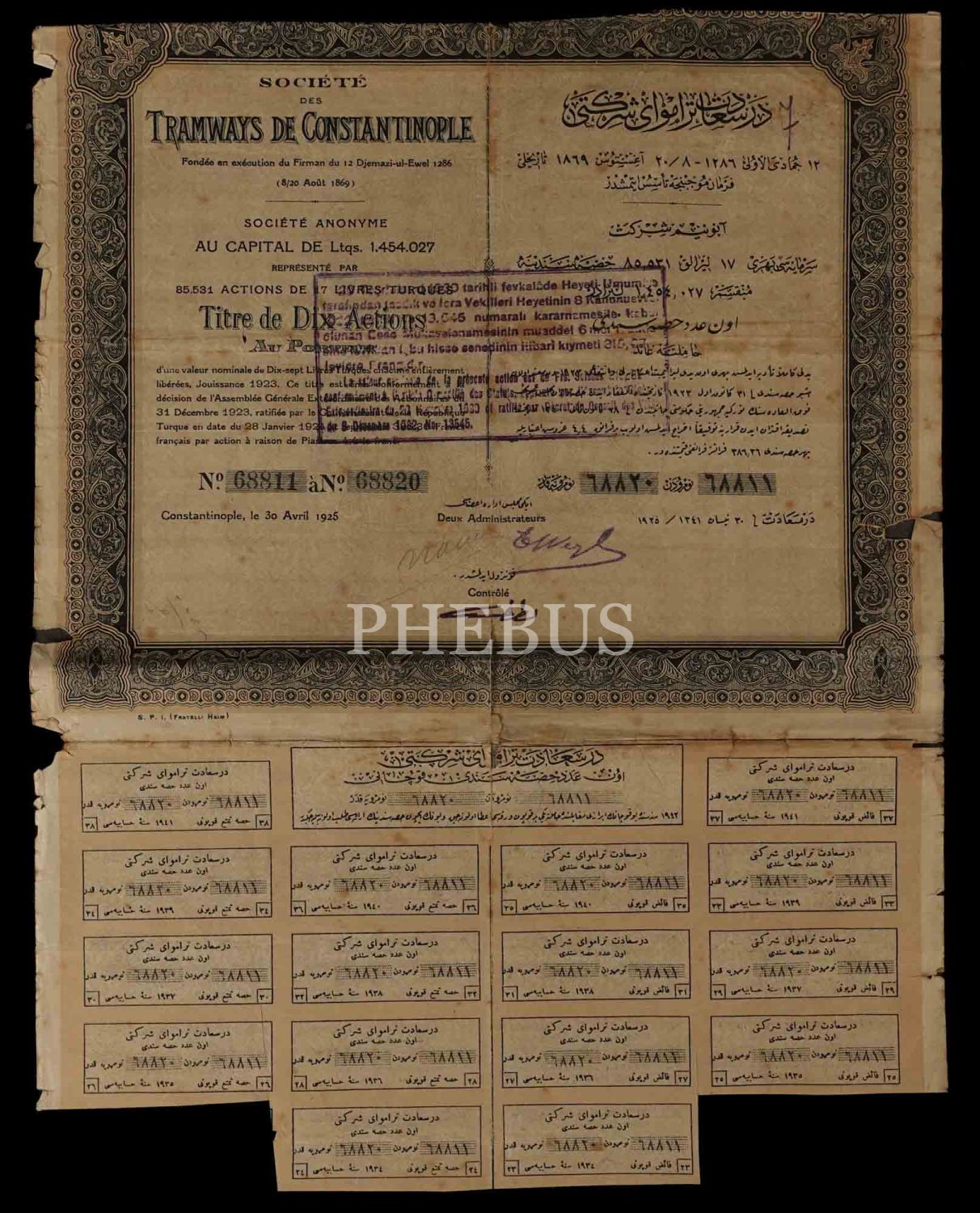 Dersaadet Tramvay Şirketi 10 aksiyon hisse senedi, Osmanlıca-Fransızca yazılı, 30 Nisan 1925 tarihli, 29x37 cm...