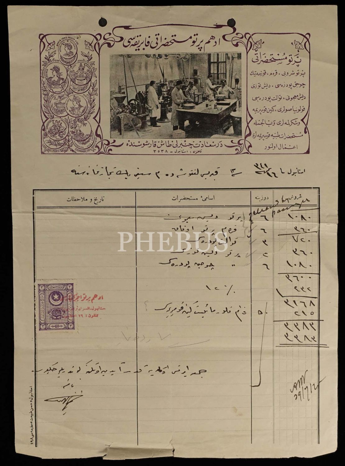 Osmanlıca antetli Edhem Pertev Müstahzaratı Fabrikası faturası, 21x29 cm...