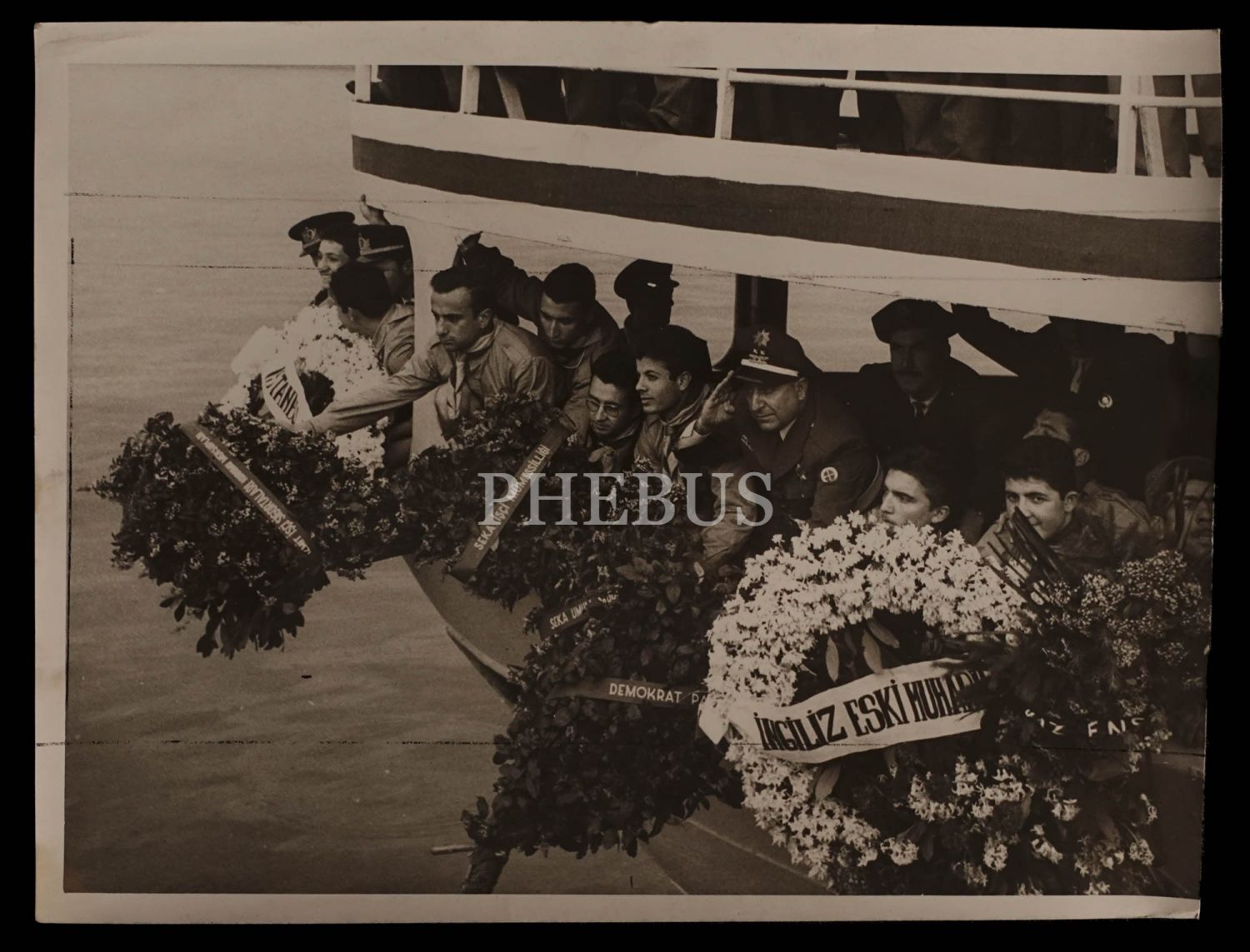 Türkiye Cumhuriyeti tarihinde bugüne kadar meydana gelen en ölümlü sivil deniz kazası olarak tarihe geçen Üsküdar Vapuru faciası sonrası vapurun battığı noktaya çelenk bırakanlar, 24x18 cm...
