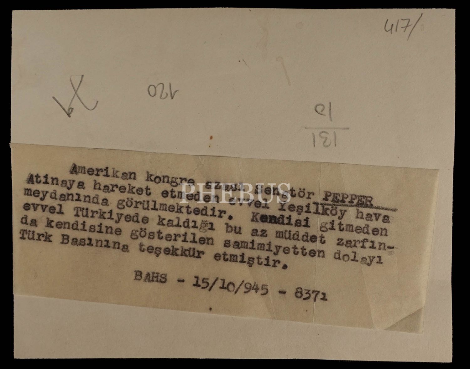 Atina´ya gitmeden önce İstanbul´a uğrayan Amerikan Kongre Azası Senatör Pepper, Yeşilköy Havalimanı´nda, 15 Ekim 1945, 10x13 cm...