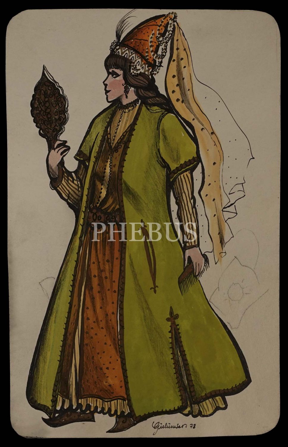 Gülümser Aral´dan ıslak imzalı, 1978 tarihli saraylı kadın çizimi, 16x26 cm...
