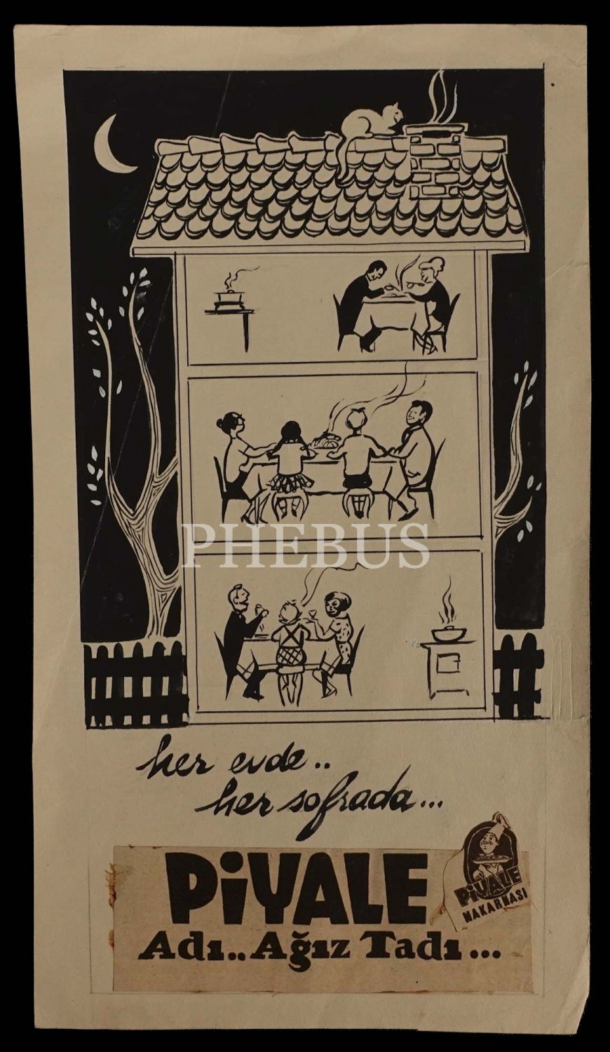 Gülümser Aral´dan Piyale Makarnası reklam çizimi, "Her evde.. Her sofrada.. Piyale Makarnası! Adı.. Ağız Tadı..", 13x23 cm...