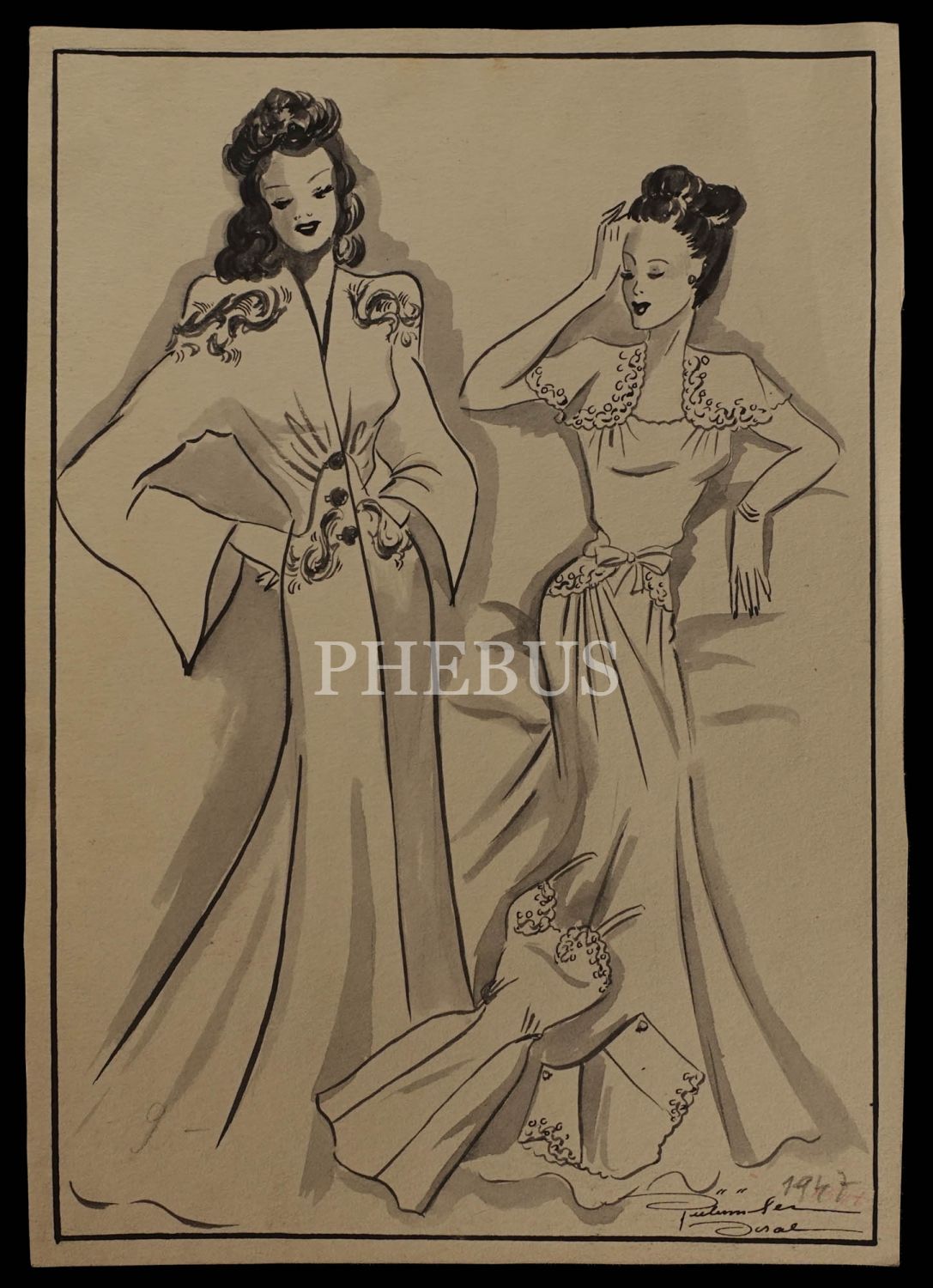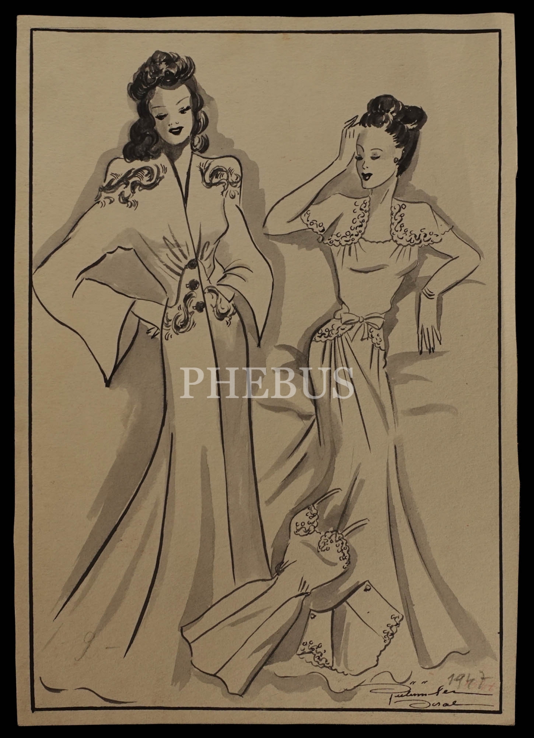 Gülümser Aral´dan ıslak imzalı, 1947 tarihli kadınlar çizimi, 15x21 cm...