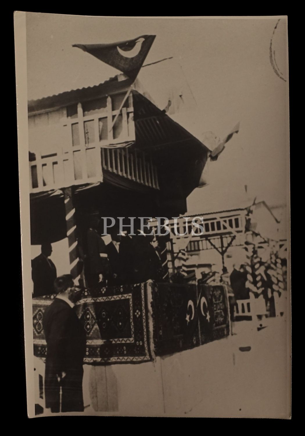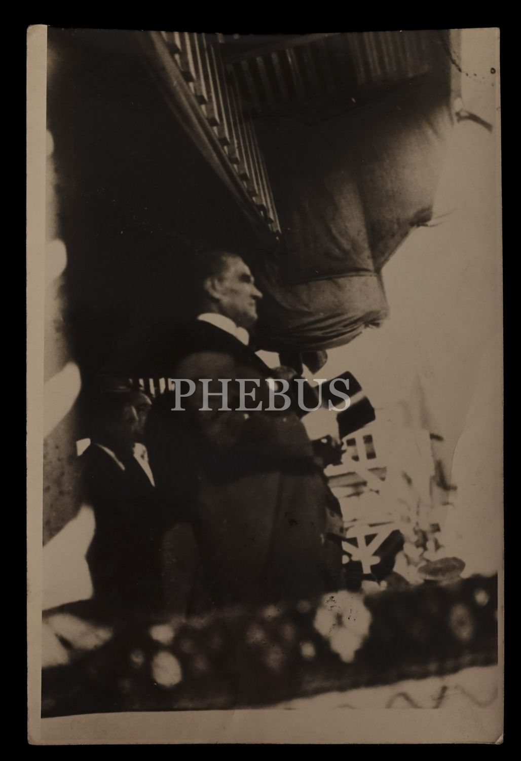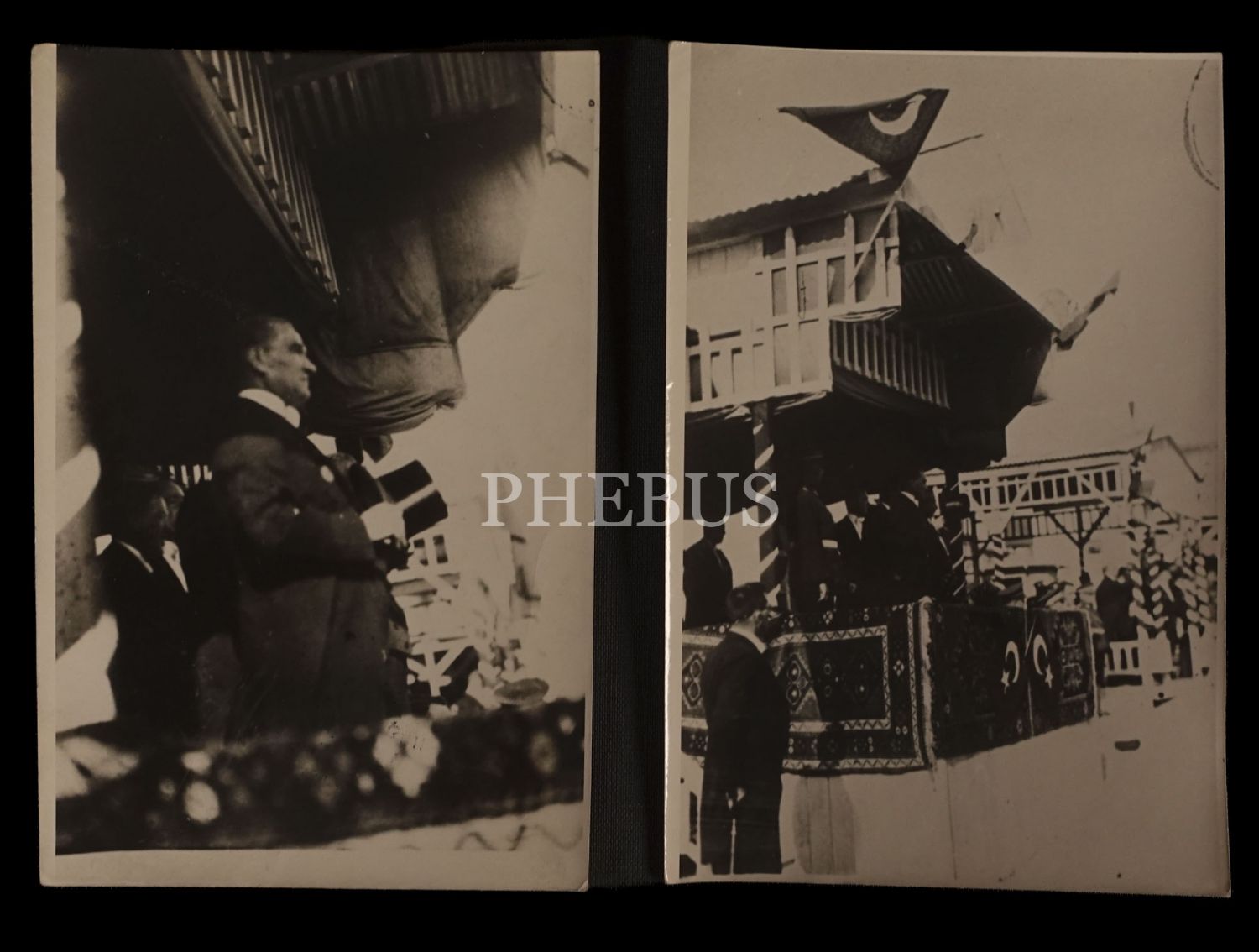 Mustafa Kemal Atatürk bir millî bayram töreninde protokol locasında, uzak ve yakın çekim olmak üzere iki adet fotoğraf, 12x18 cm...