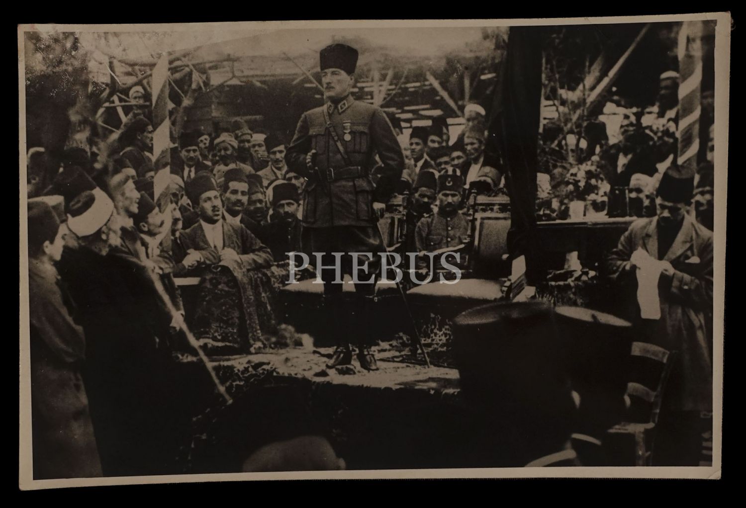 Mustafa Kemal Atatürk, Mersin Millet Bahçesi´ne kurulan platform üzerinden Mersin halkına söylev verirken, 17 Mart 1923, 18x12 cm...
