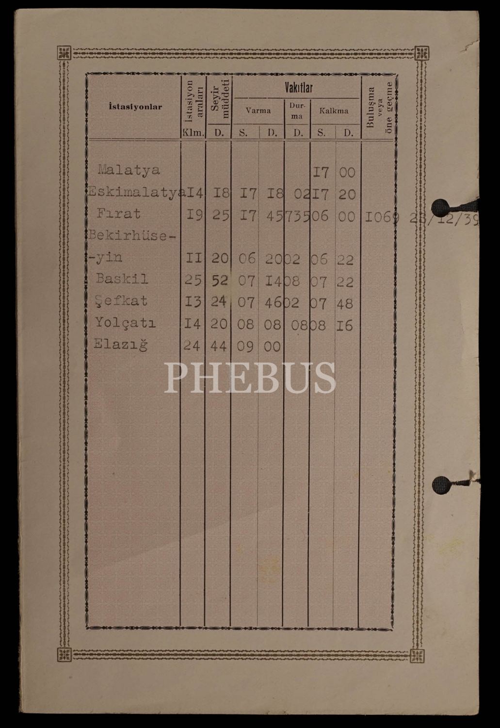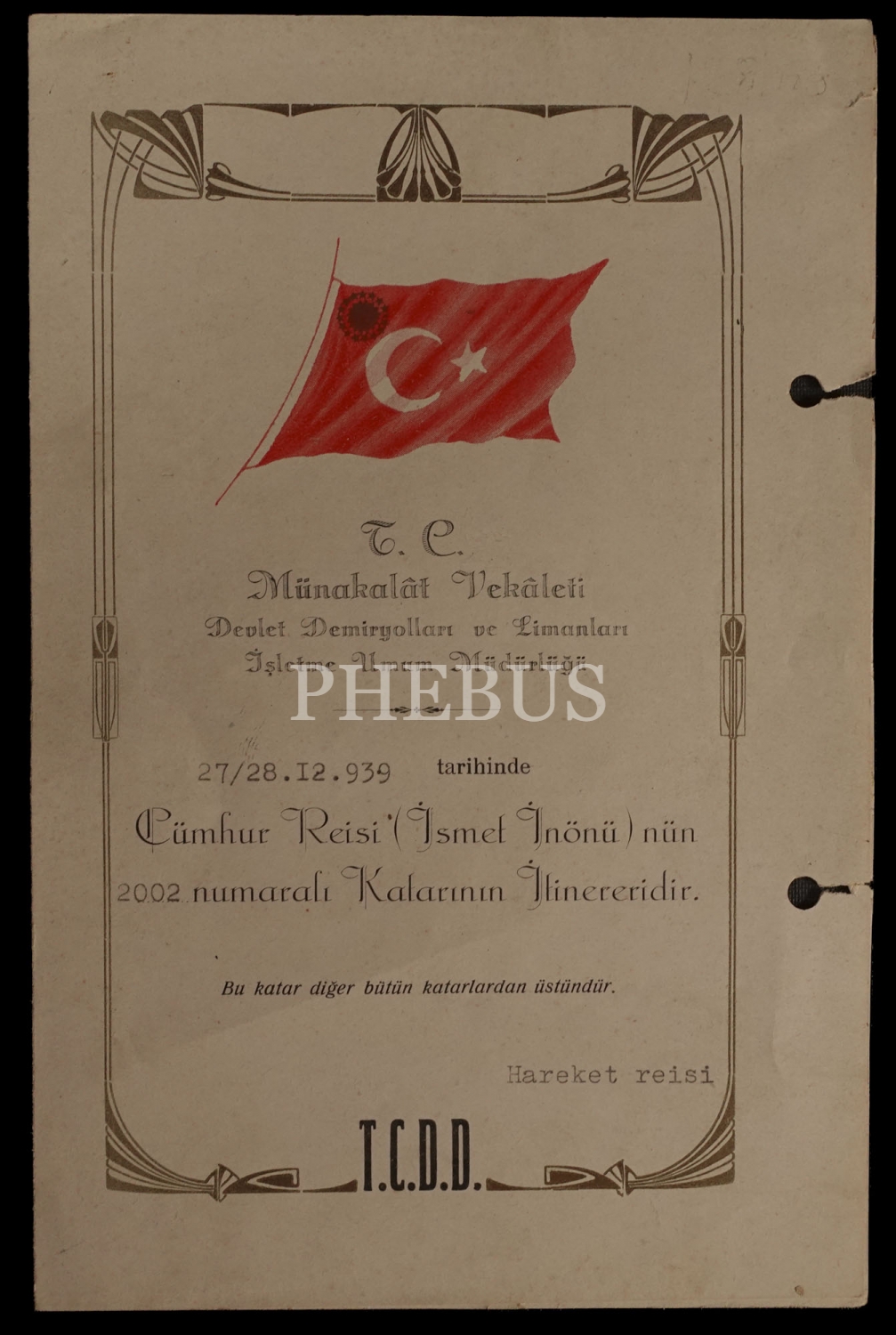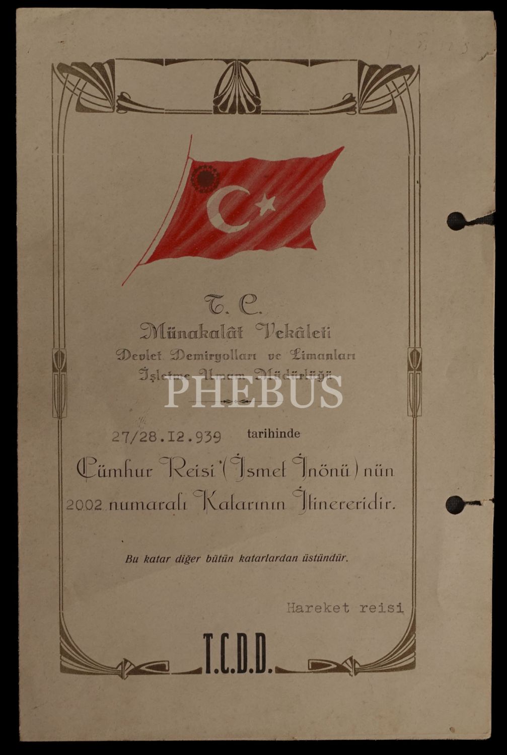 Cumhurbaşkanı İsmet İnönü´nün 27-28 Aralık 1939 tarihinde yola çıkacak 2002 numaralı katarının itinerer (rota) programı, "T.C. Münakalât Vekâleti Devlet Demiryolları ve Limanları İşletme Umum Müdürlüğü" antetli, Demiryollar Matbaası, 14x20 cm...