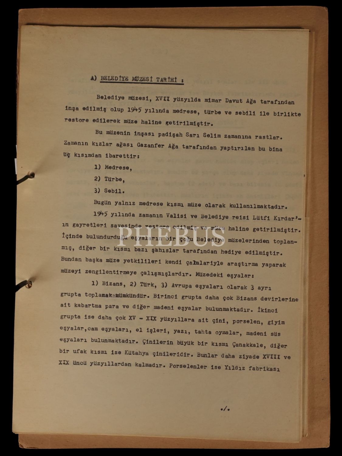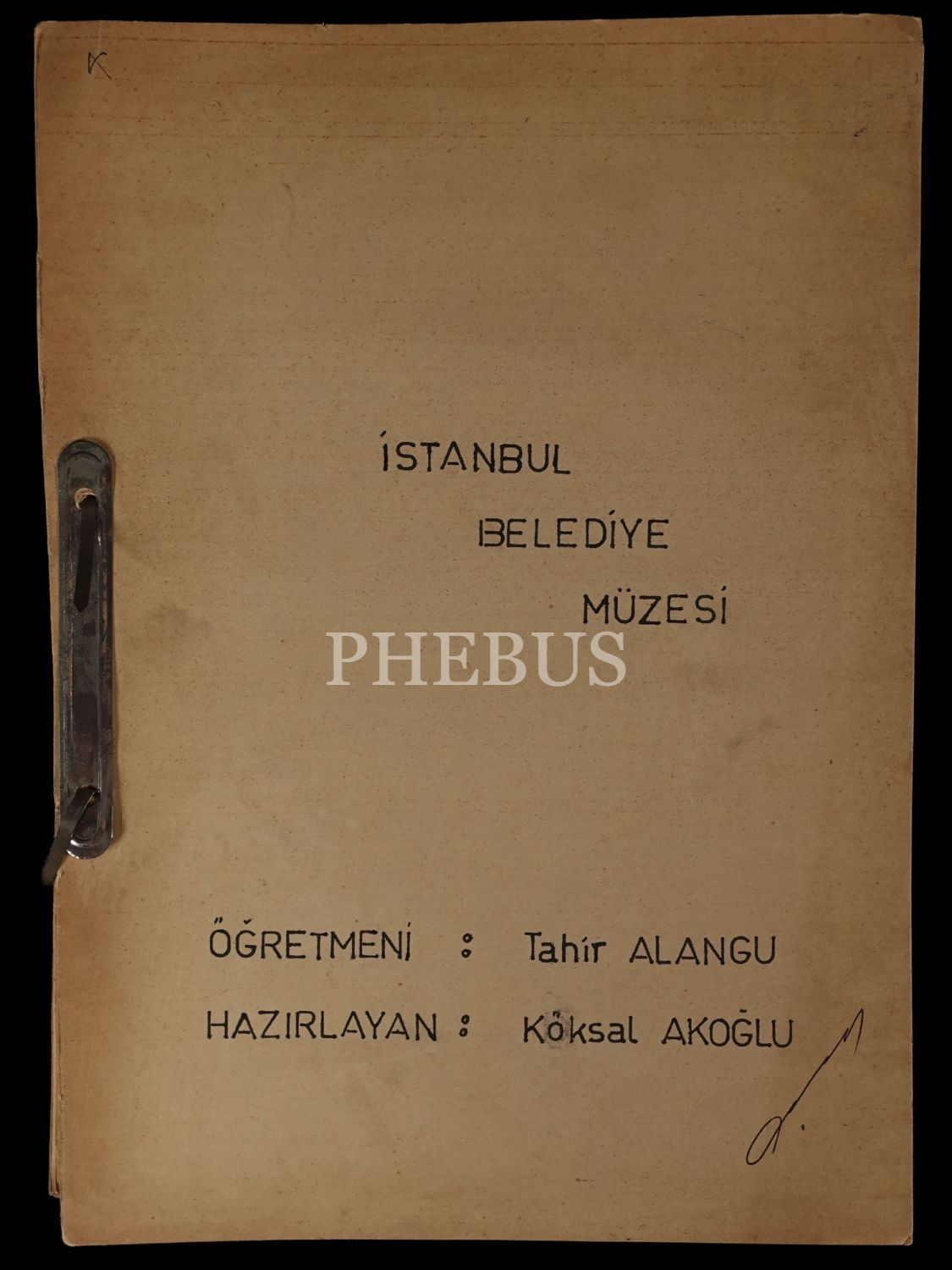 Tahir Alangu´nun öğrencisi Köksal Akoğlu tarafından hazırlanan, İstanbul Belediye Müzesi´nin toplı envanterini ihtiva eden ödev, 19 yaprak, 23x33 cm...