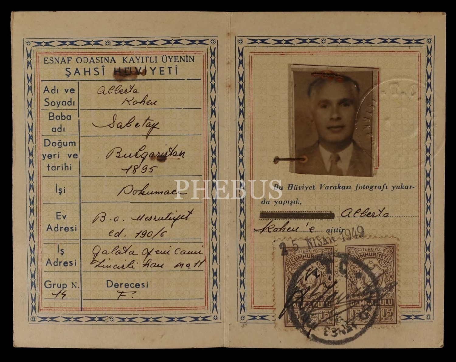 Alberto Kohen isimli bir Musevi vatandaşımıza ait T.C. İstanbul Esnaf Odası Hüviyet Varakası, 1948 tarihli, Öztürk Basım Evi, 8x13 cm...