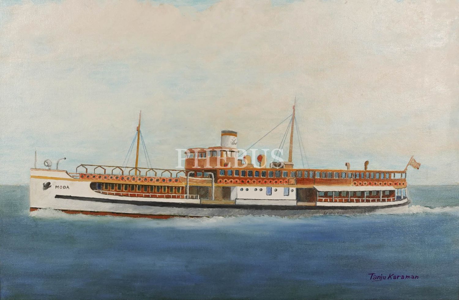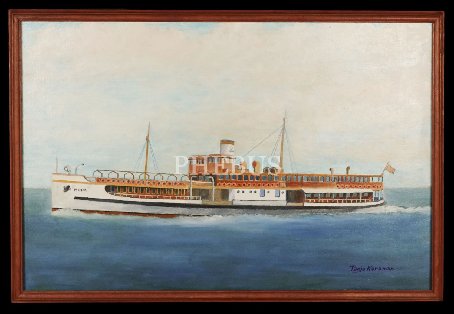 Tanju Karaman´dan ıslak imzalı "Moda Vapuru" konulu yağlı boya çalışması, çerçevesiyle birlikte 63x42 cm...